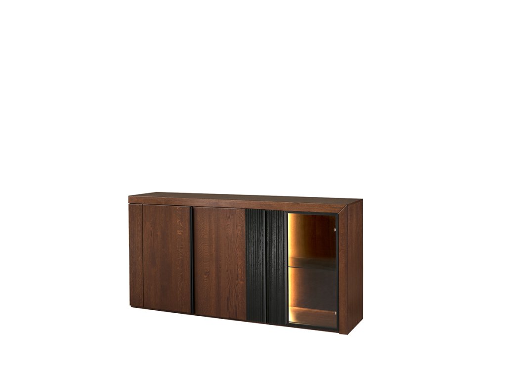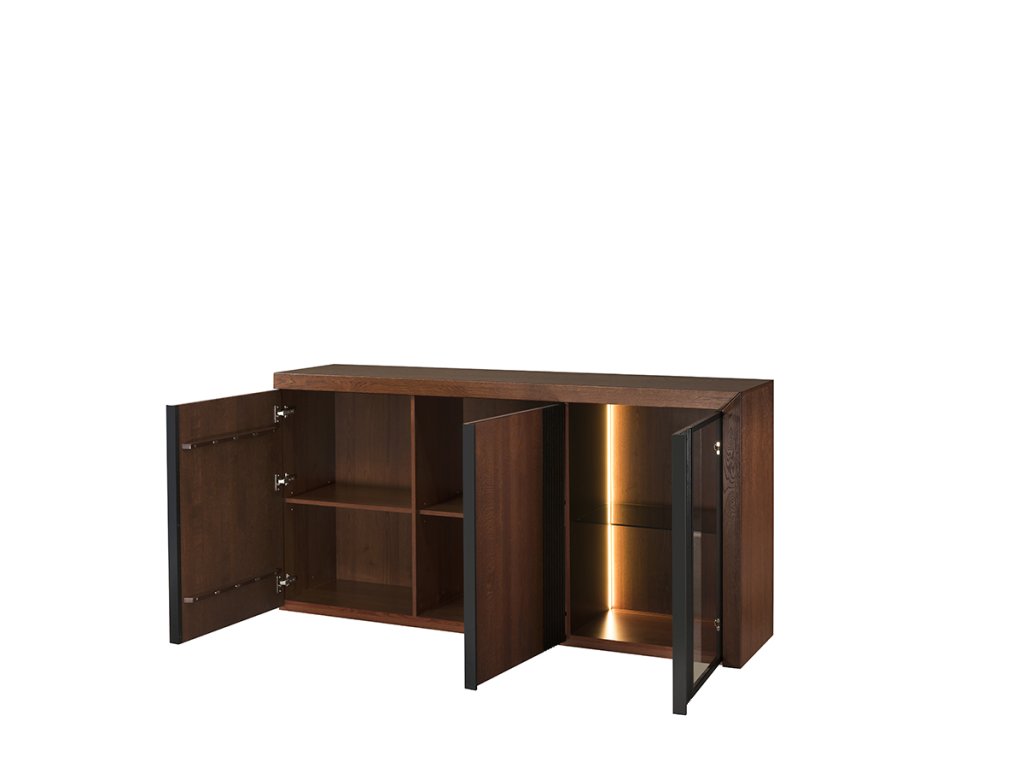 Komoda je trojdverová, jedny dvierka sú presklené. Vo vnútri sú police. Led osvetlenie je v cene.