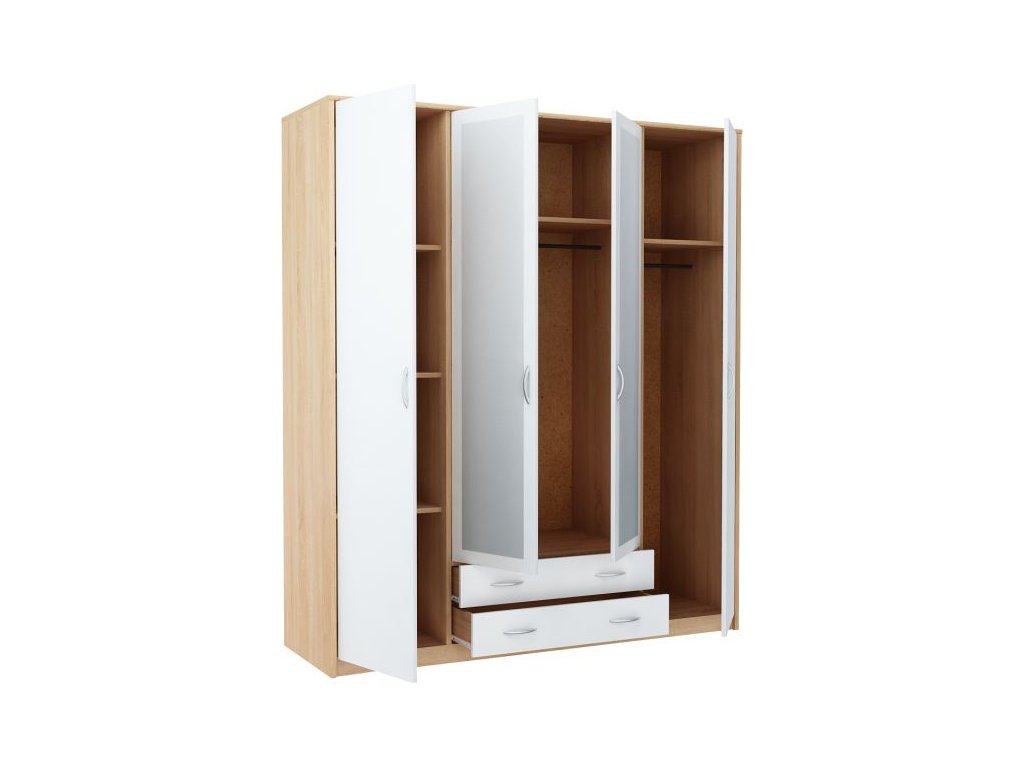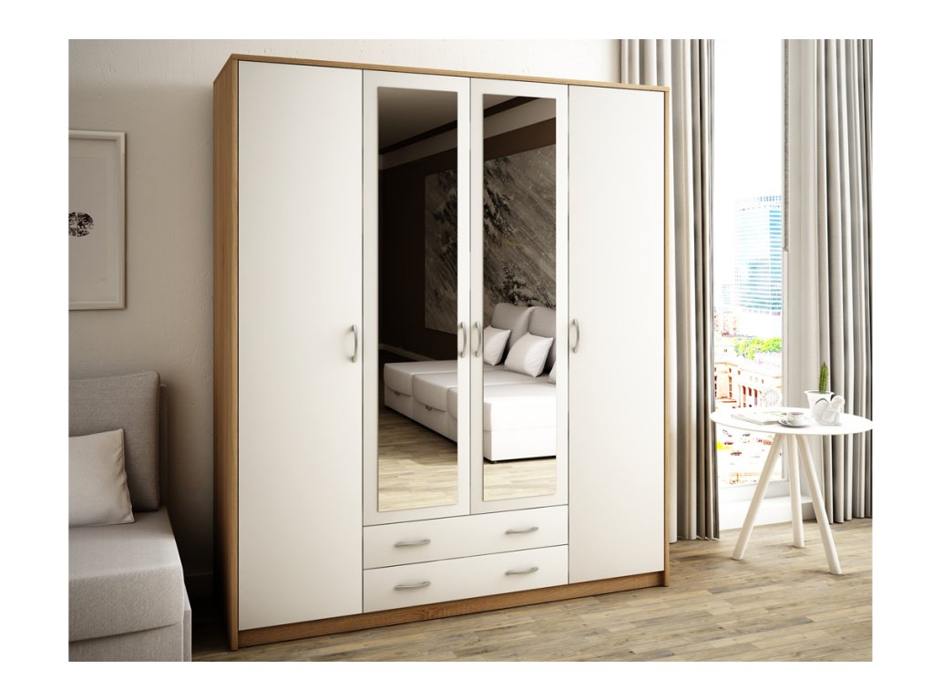 Klasická 4-dverová skriňa VILMA 4D2S je tvorená niekoľkými policami a 2-mi vešiakovými tyčami. Je vyrobená z kvalitnej LTD dosky, ktorá je ľahká na údržbu. Korpus skrine je v obľúbenom farebnom prevedení dub sonoma, dvierka sú v bielej farbe. K dispozícií máte 3 farebné prevedenia na výber. Na stredných dvierkach je vstavané veľké vertikálne zrkadlo. V spodnej časti skrine sú dve zásuvky. Pojazdy v zásuvkách sú kovové s plastovými koliečkami. Úchytky sú z plastu vo farbe alumínium oblého tvaru. Dodávame v demontovanom stave.Dodatočné parametre