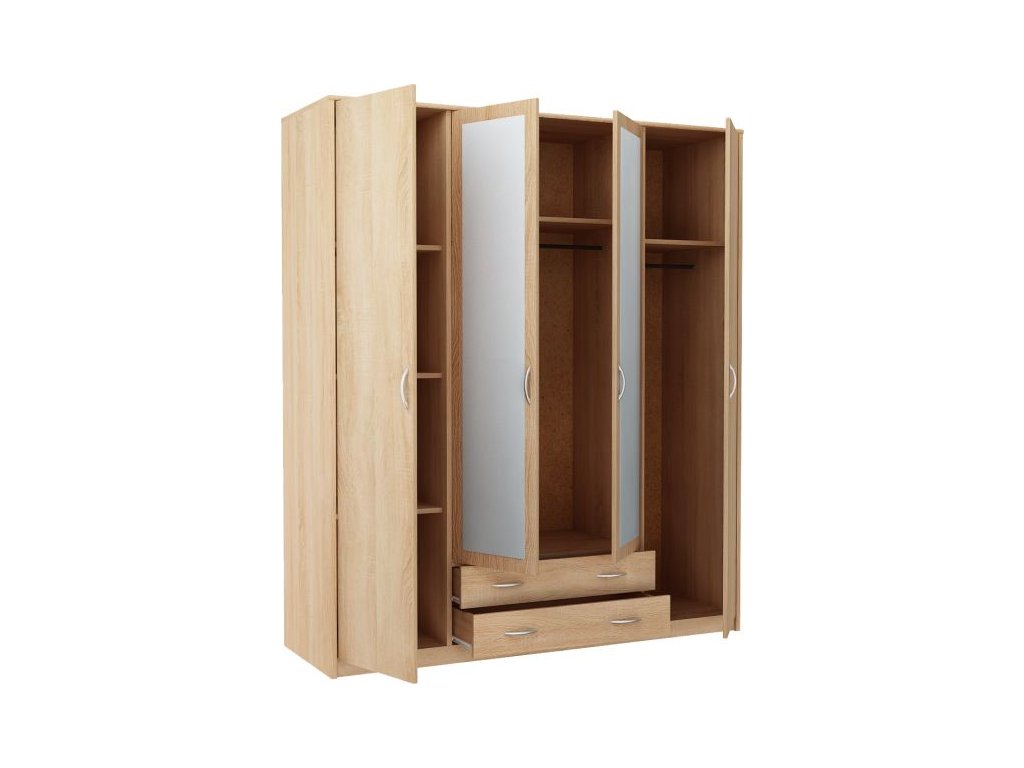 Klasická 4-dverová skriňa VILMA 4D2S je tvorená niekoľkými policami a 2-mi vešiakovými tyčami. Je vyrobená z kvalitnej LTD dosky, ktorá je ľahká na údržbu. Korpus skrine a takisto jej dvierka sú v obľúbenom farebnom prevedení dub sonoma. K dispozícií máte 3 farebné prevedenia na výber. Na stredných dvierkach je vstavané veľké vertikálne zrkadlo. V spodnej časti skrine sú dve zásuvky. Pojazdy v zásuvkách sú kovové s plastovými koliečkami. Úchytky sú z plastu vo farbe alumínium oblého tvaru. Dodávame v demontovanom stave.