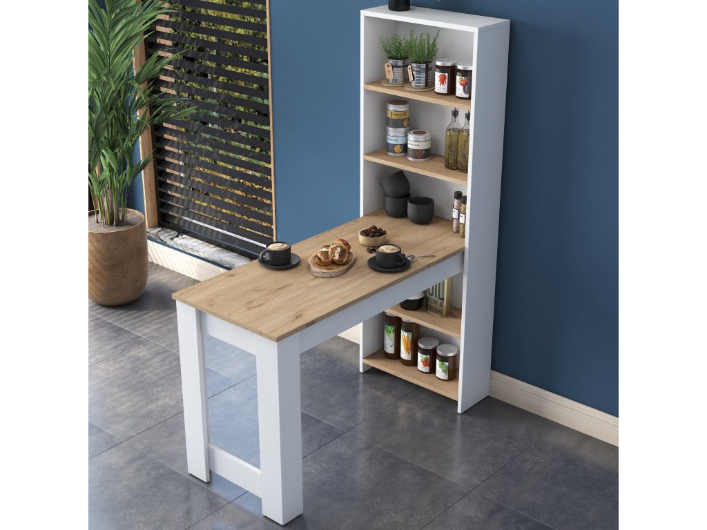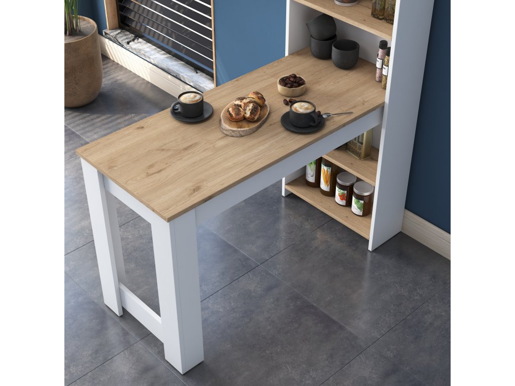 Barový stôl s regálom JAGUAR, biela/orech