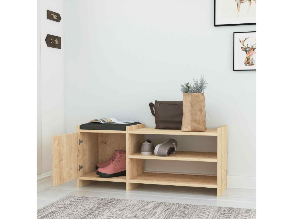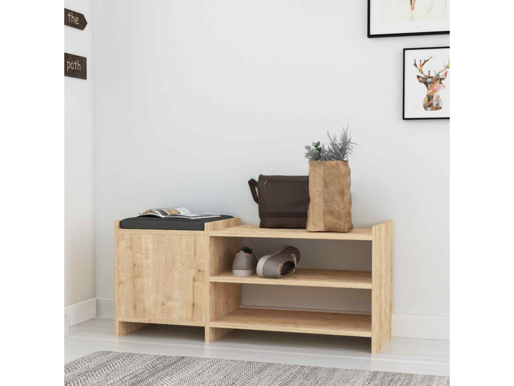 Botník CLAID je vyrobený z kvalitných materiálov, čo zaručuje jeho odolnosť a dlhú životnosť. Premyslená konštrukcia s lavicou ponúka pohodlné sedenie pri obúvaní, zatiaľ čo dvierka skrývajú priestrannú skrinku pre vaše topánky. Navyše praktický regál poskytuje dodatočný úložný priestor pre obuvné príslušenstvo. Botník CLAID prináša do vašej predsiene nielen funkčnosť, ale aj nádych luxusu a štýlu.