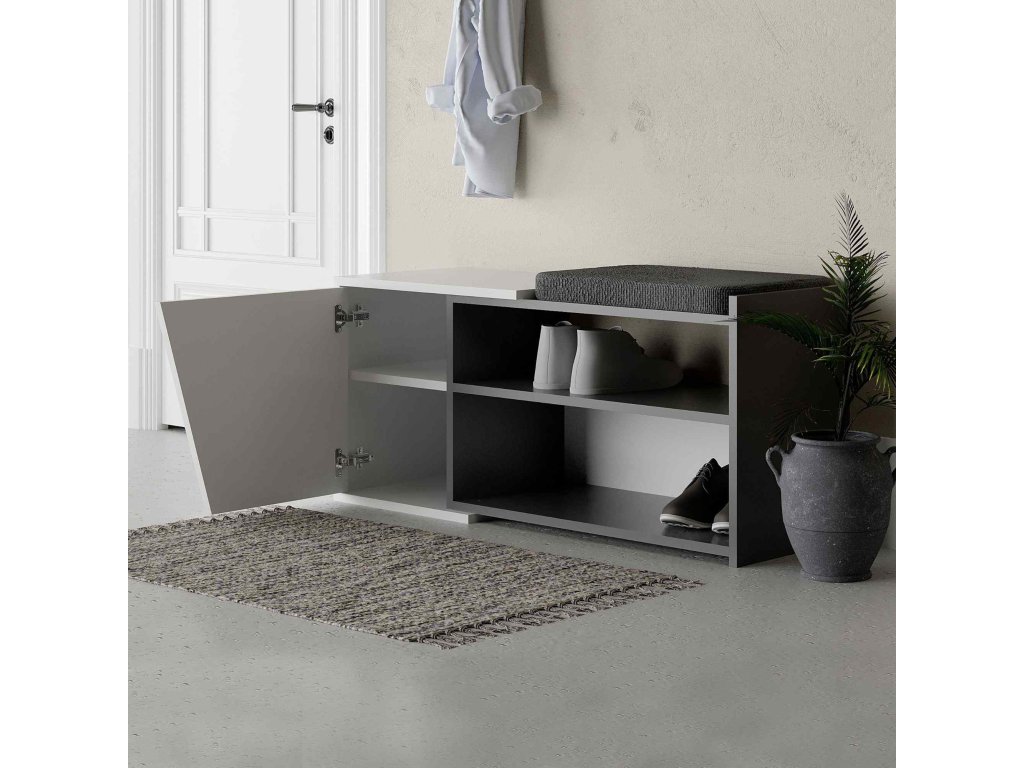 FUTURE ponúka riešenie pre tých, ktorí si cenia organizáciu a elegantný dizajn. Vďaka dvierkam a skrinke získate veľa úložného priestoru, zatiaľ čo pohodlné sedenie s lavicou a regálkom poskytuje miesto, kde si môžete pohodlne obuť topánky.