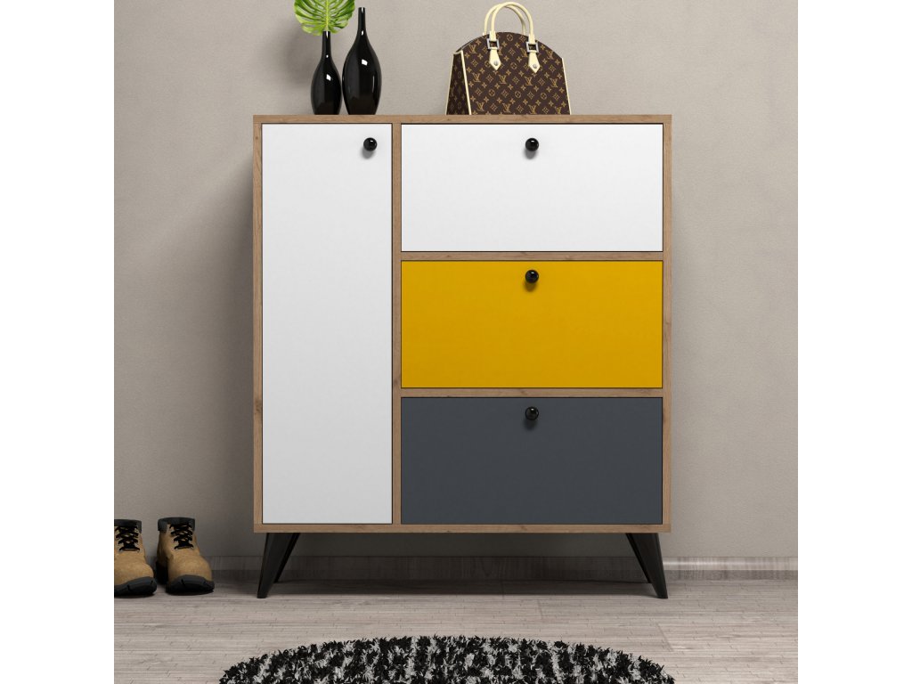 S tromi priestrannými zásuvkami a početnými policami ponúka táto skrinka na topánky dostatok úložného priestoru pre všetku vašu obuv. Elegantný dizajn a moderné farebné varianty dub, biela, žltá a antracit doplnia akýkoľvek štýl interiéru a dodajú vášmu priestoru nádych sofistikovanosti.
