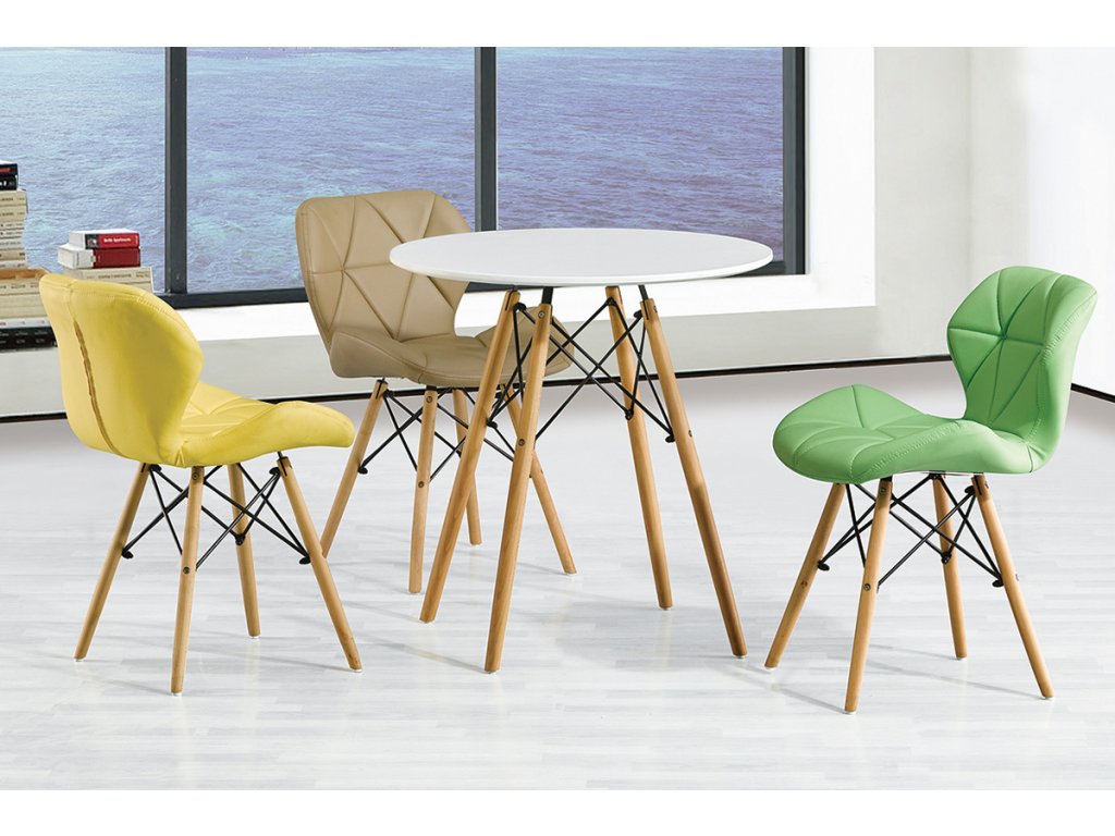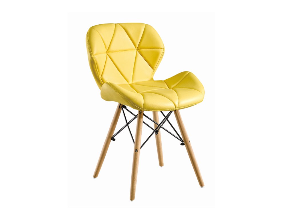 Moderná čalúnená stolička DORSET je vyrobená v žiadanom farebnom prevedení. Jej ergonomický tvar zaručuje pohodlné sedenie a oporu. Efektné prešitie vytvára zaujímavý trojuholníhový dekór, ktorý zvýrazňuje celkové prevedenie stoličky. Nožičky sú z prírodného masívu vo farbe buk, skombinovaného s kovovými časťami v čiernej farbe. Sedacia a opierková časť je z eko-kože v žiarivej žltej farbe.