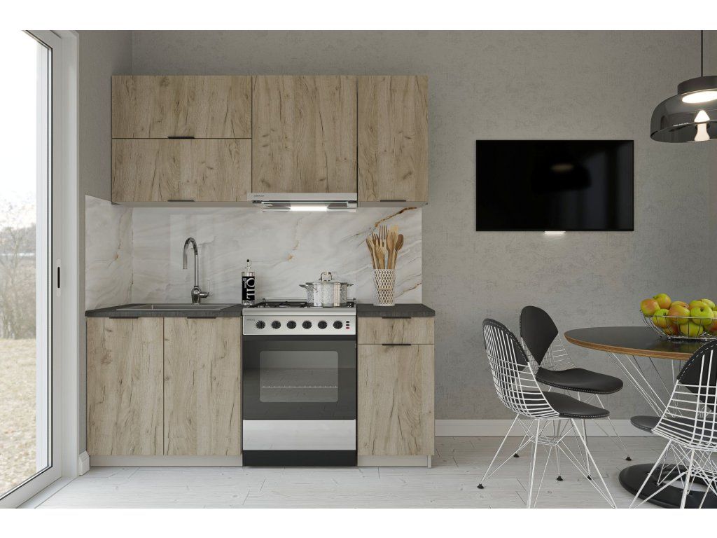 Moderná kuchyňa CAPRI K 180 vás zaujme svojim praktickým a zároveň štýlovým prevedením. Je vhodná do malých a moderných interiérov. Disponuje množstvom úložného priestoru. Kuchynské skrinky sú vyrobené z kvalitných LTD dosiek. Ich údržba je nenáročná. Úchyty sú kovové, v čiernej farbe.