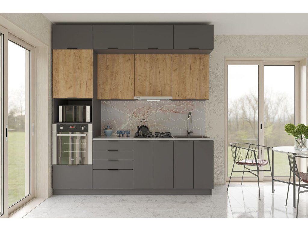 Štýlová vysoká kuchynská linka DENIS K 240, vás zaujme svojim praktickým a zároveň trendovým prevedením. Disponuje množstvom úložného priestoru vďaka nadstaveným výklopným skrinkám, ktoré funkčne využijú priestor.