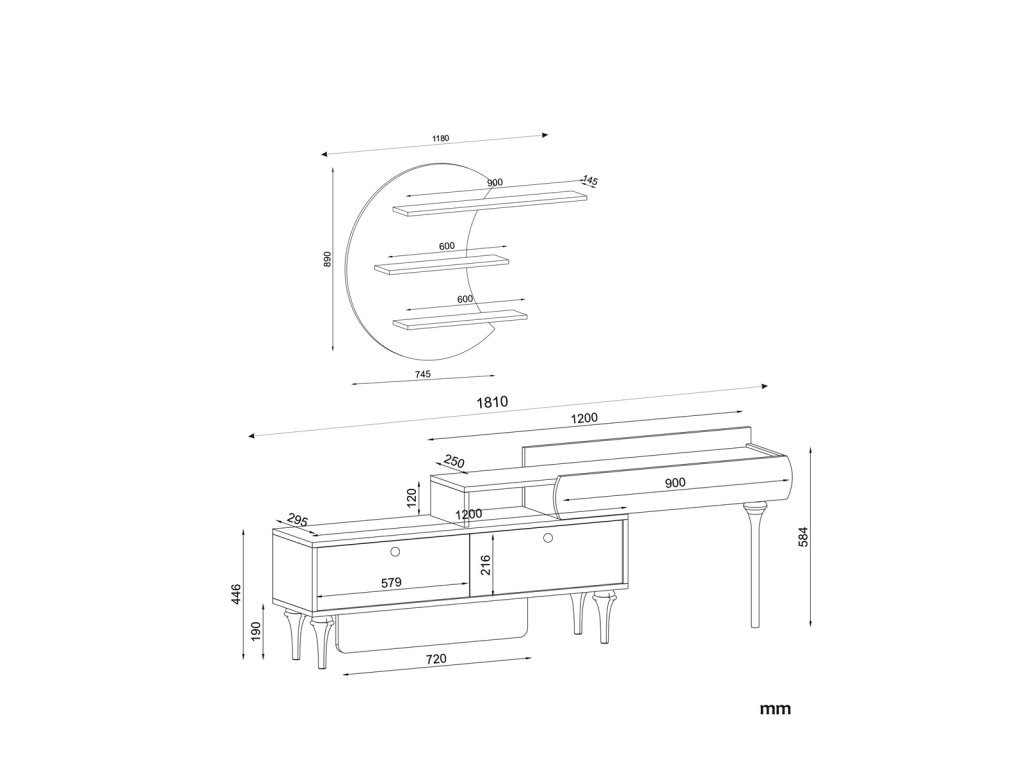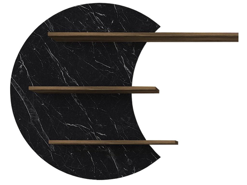 Dizajnová malá TV stena DELUXE PADRE vás vďaka svojmu netradičnému prevedeniu prenesie do sveta orientu a rozprávok tisíc a jednej noci. Tento nábytok je charakteristický výraznou kresbou dreva, ktorá je doplnená orientálnymi prvkami a farbou čierneho mramoru. TV skrinka poskytuje dostatok úložného priestoru vo forme otvorenej police aj zatvorených skriniek. Zaujímavé sú tiež police na stenu na zaujímavom podklade v tvare pol mesiaca, ktoré Vám poskytnú priestor na vystavenie dekorácií či kníh a dodajú celej miestnosti neobvyklý orientálny charakter. 181 x 58,4 x 29,5 cm (ďalšie rozmery v nákrese)