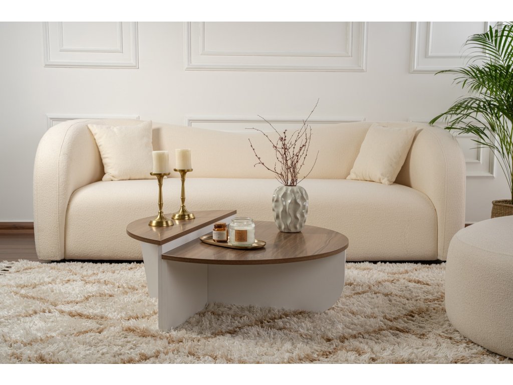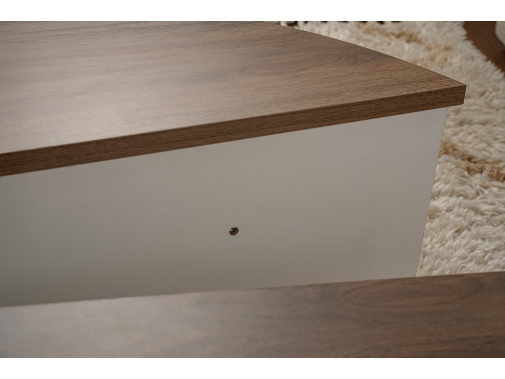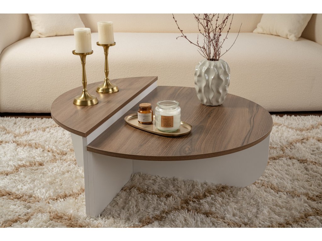 Premeňte svoj obytný priestor s naším úžasným konferenčným stolíkom, vyrobeným zo 100% melamínovo potiahnutej drevotriesky pre odolnosť a štýl. Elegantný dizajn a moderná farebná kombinácia orecha a bielej okamžite pozdvihnú váš domov a vytvoria pre vás aj vašich hostí teplú a príjemnú atmosféru.