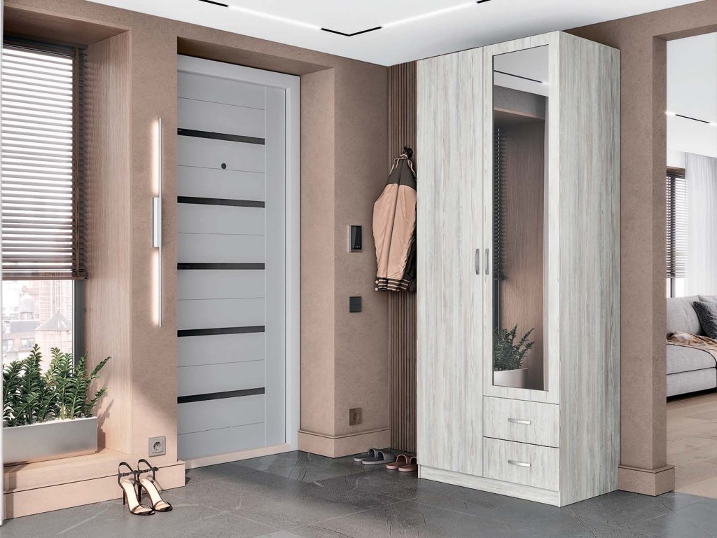 Obdĺžnikový tvar a šírka 80 cm poskytujú dobrú organizáciu vnútorného priestoru. Skriňa je vybavená šatníkovou tyčou, tromi policami a dvomi zásuvkami na drobnosti. Praktickým doplnkom je zrkadlo, ktoré zvyšuje komfort pri každodennom používaní a opticky zväčšuje miestnosť. Vyhotovenie z materiálu LTD zaručuje jednoduchú údržbu.