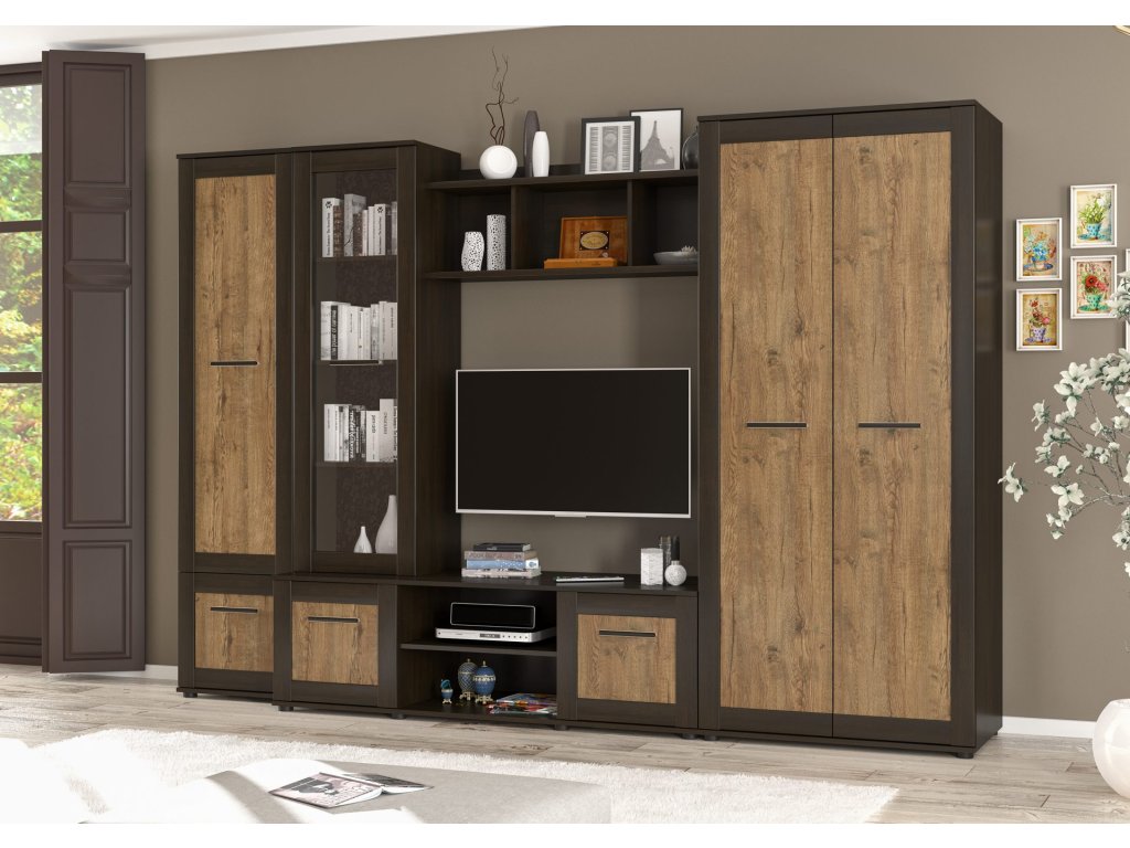 Obývacia stena má v spodnej časti stolík pod TV, v hornej časti je odkladacia polica. Po oboch stranách sú vysoké skrine s policami, pričom jedna z nich disponuje vitrínou.