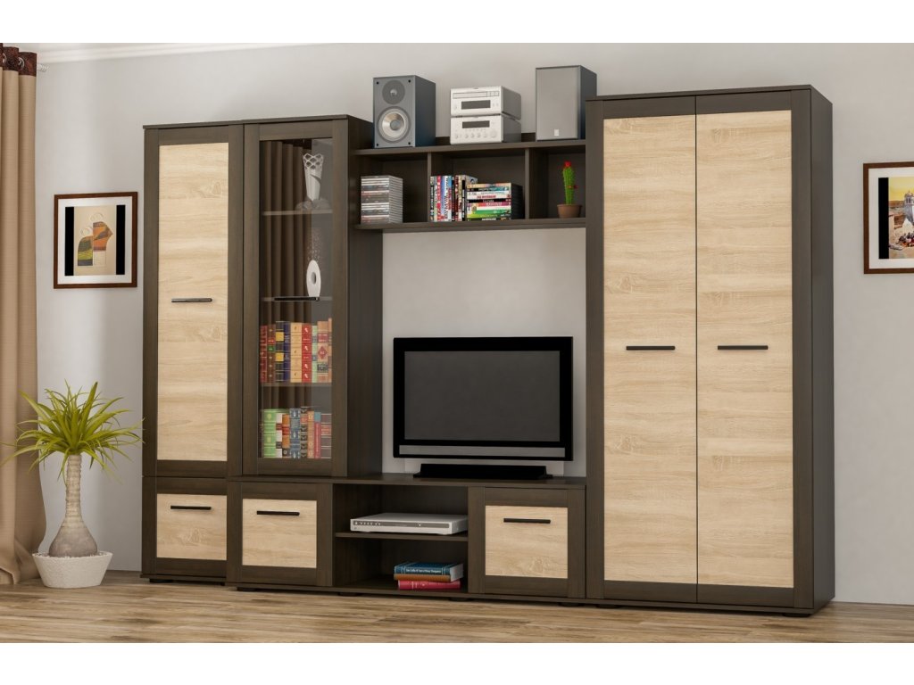 Obývacia stena má v spodnej časti stolík pod TV, v hornej časti je odkladacia polica. Po oboch stranách sú vysoké skrine s policami, pričom jedna z nich disponuje vitrínou.