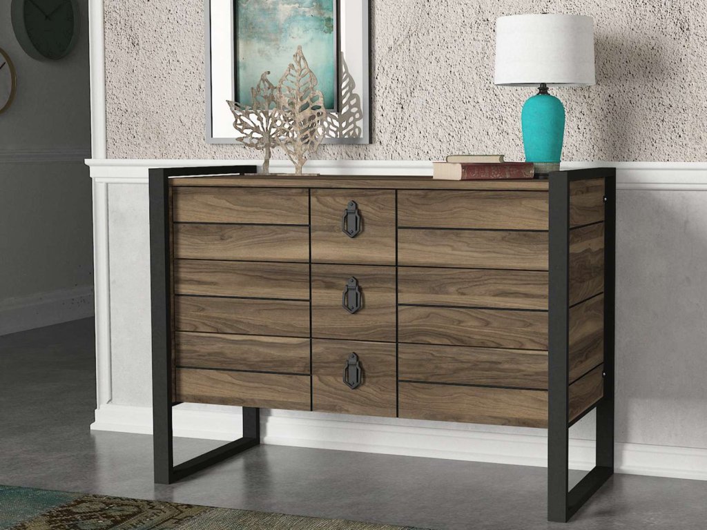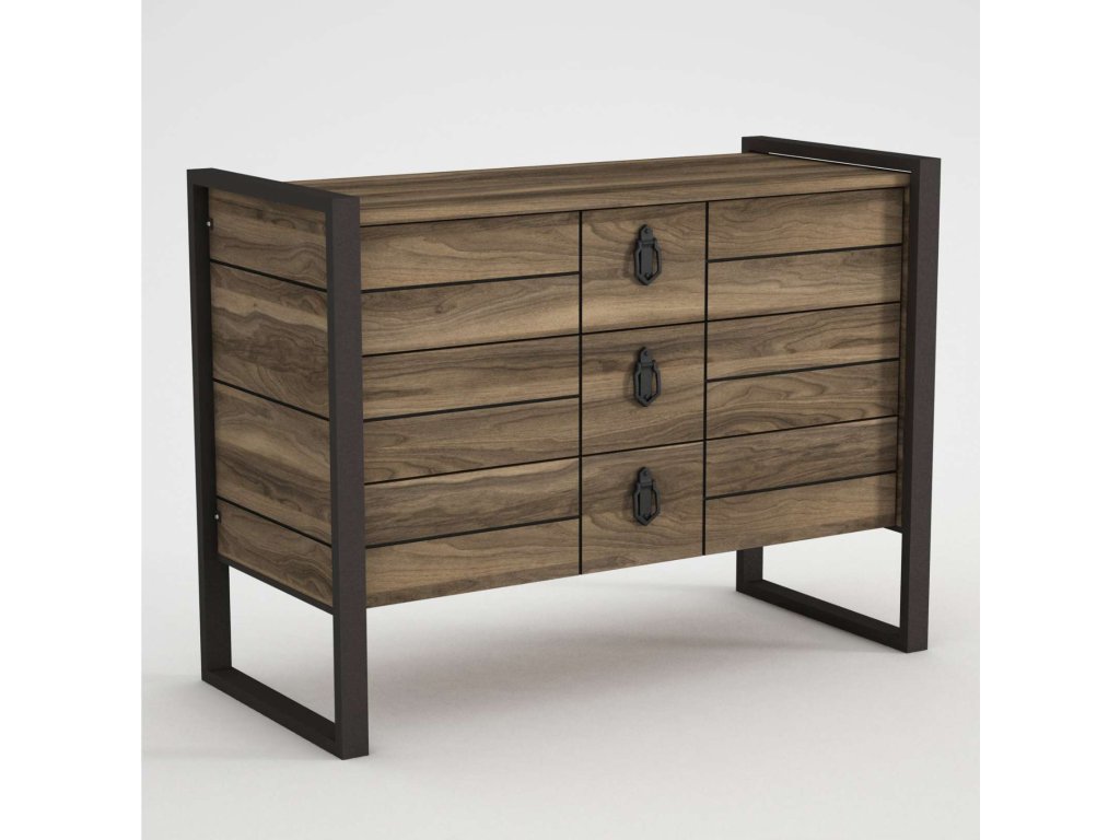 Komoda LUST K sa vyznačuje elegantným orechovým prevedením, ktoré je doplnené kovovými prvkami, ktoré dodávajú nábytku typický industriálny vzhľad. Tri priestranné zásuvky poskytujú dostatok úložného priestoru pre vaše veci, čo uľahčuje udržiavanie poriadku vo vašej obývačke.