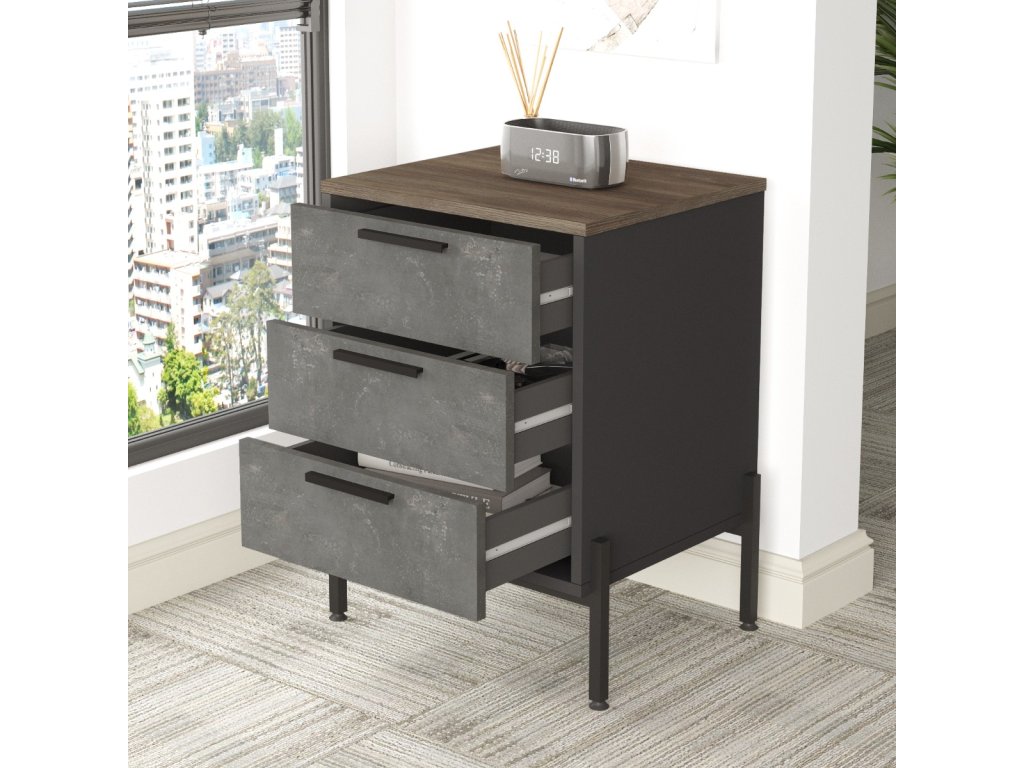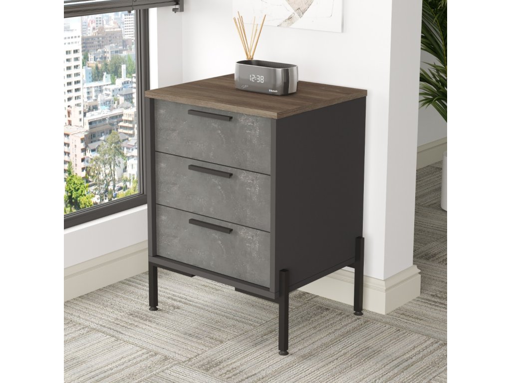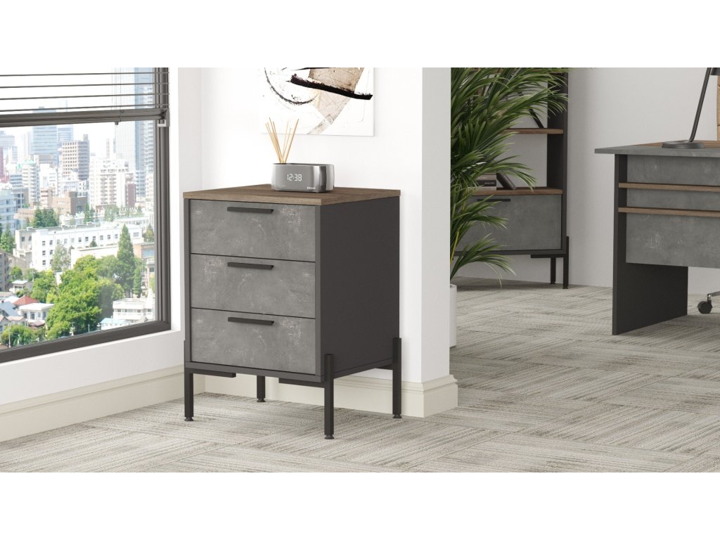 Výrobok VISTA 3 predstavuje dokonalú symbiózu medzi funkčnosťou a dizajnom. S jeho industriálnym charakterom a loftovým štýlom, táto komoda skrinka je pripravená stať sa centrálnym bodom vašej kancelárie alebo pracovne. Trojica zásuviek zaisťuje, že budete mať vždy po ruke všetko, čo potrebujete, zatiaľ čo jeho impozantný dekor dodáva miestnosti silný estetický príbeh.