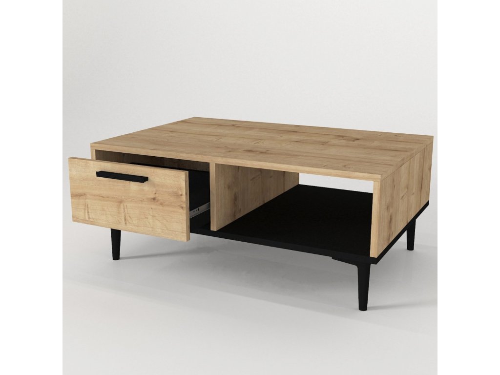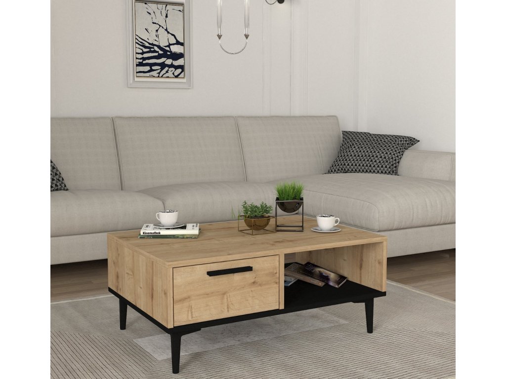 Dizajnový konferenčný stolík NEFET oživí nejednu obývaciu izbu. Jednoduché tvary pôsobia minimalisticky a zároveň moderne aj vďaka čiernym nožičkám. Stolík ponúka dostatok odkladacieho priestoru na uloženie časopisov, kníh alebo iných predmetov, ktoré chcete mať po ruke a to vo forme odkladacej police alebo praktickej zásuvky.