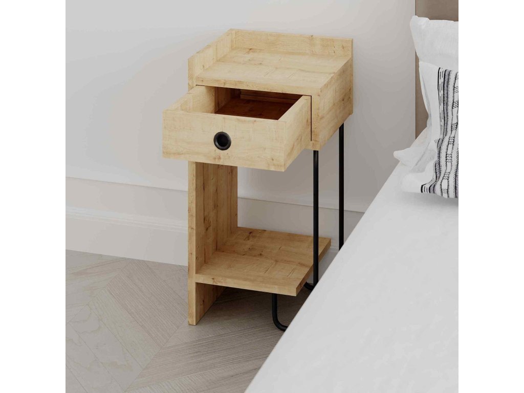 Oživte svoju spálňu nočným stolíkom SNAPE, ktorého dizajn spája loftovú surovosť s teplým vzhľadom dreva vo farbe duba.