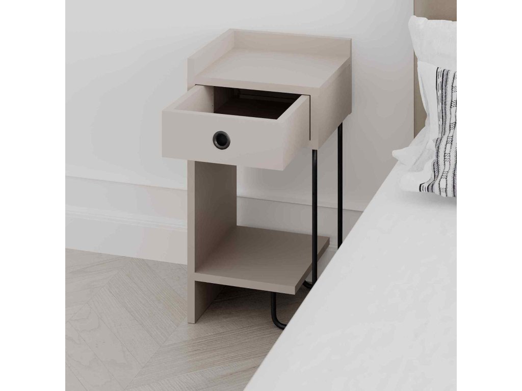 Predstavte si spojenie loftového dizajnu s elegantným odtieňom svetlá mocca. Nočný stolík SNAPE prináša tento jedinečný mix do vašej spálne.