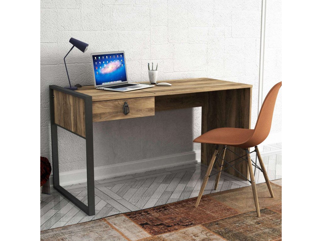 Písací stôl LUST je vyrobený z kvalitného LTD materiálu a kovu s hrúbkou 18 mm, čo zaisťuje jeho pevnosť a dlhú životnosť. Elegantná orechová farba dodáva stolu moderný a štýlový vzhľad, ktorý sa hodí do akéhokoľvek interiéru. Stôl je vybavený praktickou zásuvkou, ktorá poskytuje dostatok úložného priestoru pre vaše pracovné potreby a pomôcky.