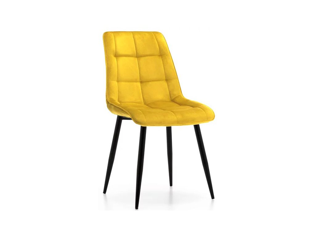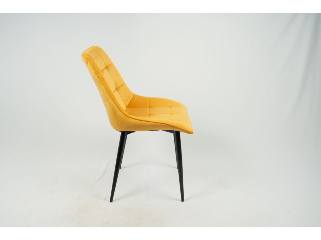 Stolička má kovové nohy v čiernom farebnom prevedení. Čalúnené časti sú potiahnuté kvalitnou zamatovou látkou vo farebnom prevedení curry žltá. Prešívanie na opierke vytvára štýlový vzor.