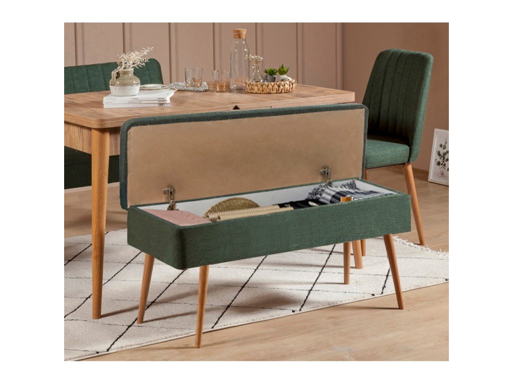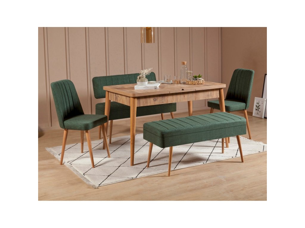 Povrchová úprava jedálenského stola a stoličiek z atlantskej borovice dodá každému priestoru nádych sofistikovanosti, zatiaľ čo žiarivá zelená farba látkových sedákov prináša osviežujúci farebný akcent. Táto kombinácia vytvára harmonickú zmes, ktorá okamžite pozdvihne štýl vášho domova.