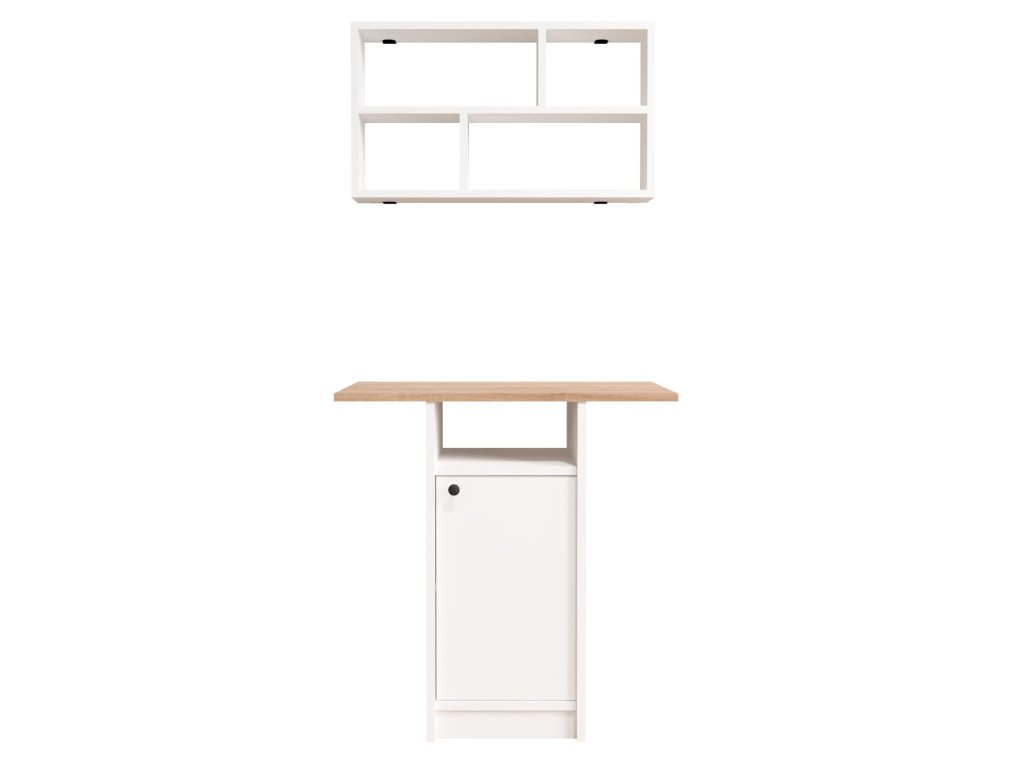 Set je vyrobený z kvalitného melamínu a VT laminátu, čo zabezpečuje pevnosť, stabilitu a jednoduchú údržbu. Výnimočným prvkom je skrinka v nohe stola, ktorá ponúka praktický úložný priestor. Úchytky z matného čierneho kovu dodávajú nábytku moderný kontrast.