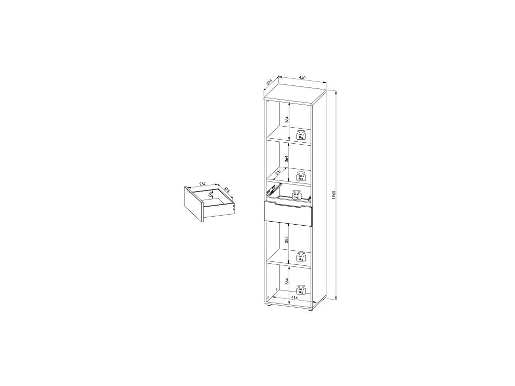 Regál disponuje praktickými policami, v strednej časti sú zásuvky.