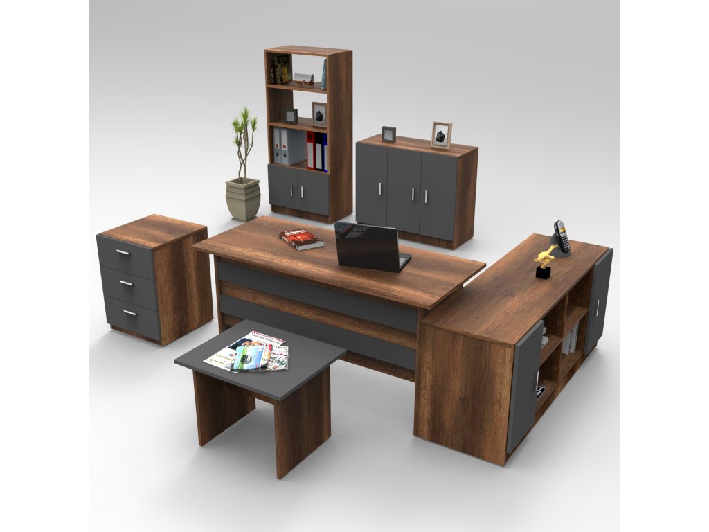 Kancelársky set VARIO 17 je navrhnutý pre modernú pracovňu, ktorá potrebuje funkčné a estetické vybavenie. Zostava zahŕňa písací stôl, konferenčný stolík, dve priestranné komody, malú komodu a regál. Vďaka precíznemu spracovaniu z LTD materiálu a farebnej kombinácii Baroko + antracit splní tento set všetky vaše požiadavky na organizáciu a design.
