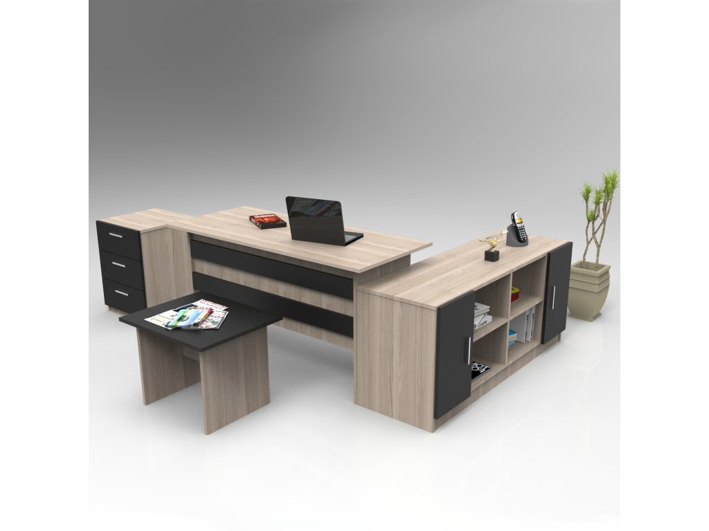 VARIO 13 ponúka všetko, čo potrebujete pre pohodlnú a efektívnu prácu. Písací stôl poskytuje dostatok priestoru pre každodenné úlohy, konferenčný stolík je ideálny na jednanie alebo odkladanie dokumentov, priestranná komoda umožňuje uloženie väčšieho množstva šanónov či materiálov a menšia komoda poskytuje ďalšie praktické úložné možnosti.