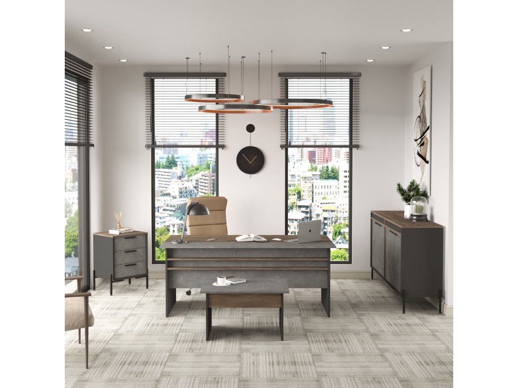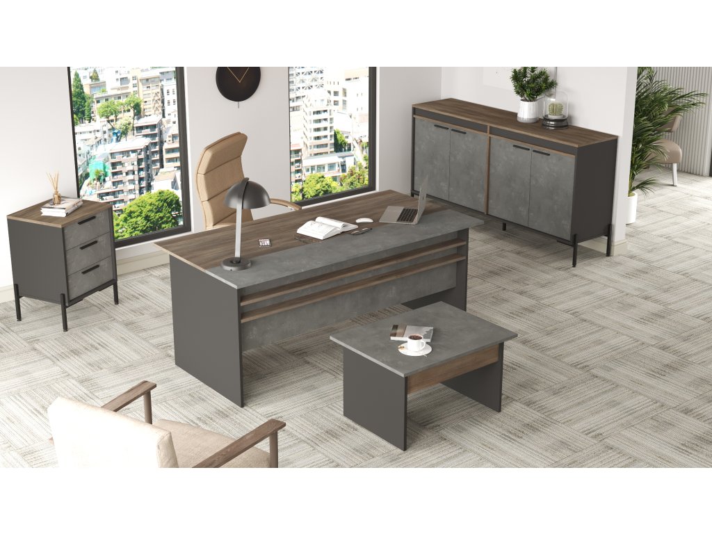 VISTA 8 kombinuje funkčnosť a moderný dizajn. Priestranný písací stôl poskytuje dostatok miesta na prácu na projektoch a organizáciu dokumentov. Konferenčný stolík je ideálny na jednanie, relaxáciu alebo odkladanie materiálov. Malá komoda je perfektným riešením pre kancelárske potreby, zatiaľ čo väčšia komoda ponúka dostatok úložného priestoru pre šanóny, knihy alebo dekorácie.