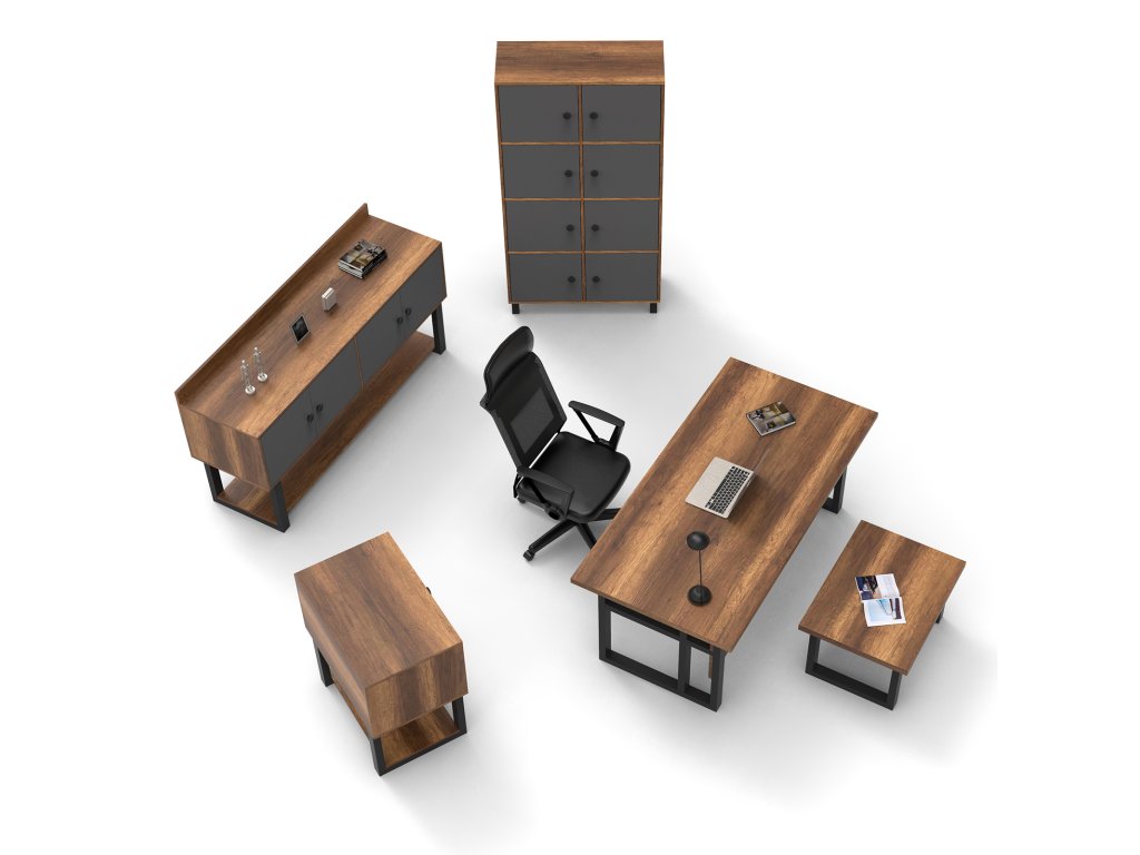 | Zostava obsahuje: | písací stôl 180x90x73cm, konferenčný stolík 80x60x43cm, malá komoda 80x52x85cm, konzola 180x54x93cm, vysoká komoda 96x40x180cm |