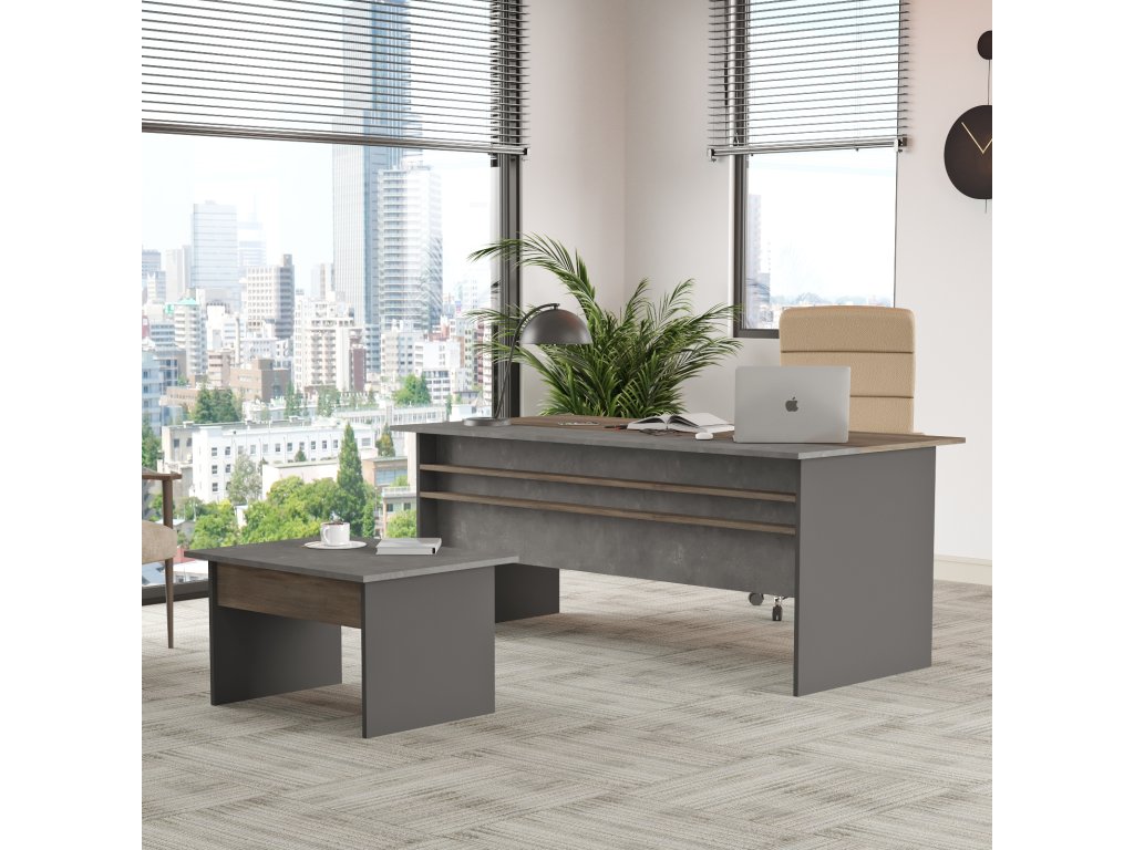 Kancelársky set VISTA 6 je navrhnutý pre moderné pracovne, ktoré kladú dôraz na funkčnosť a estetiku. Kombinácia materiálu LTD a elegantné farebné prevedenie bavlna+betón+antracit dodáva interiéru jedinečný vzhľad. Zostava obsahuje priestranný písací stôl a konferenčný stolík, ktoré zaisťujú dostatok miesta pre efektívnu prácu aj jednanie.