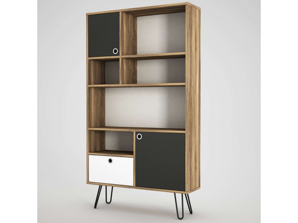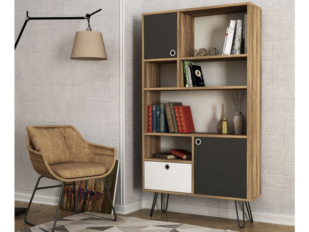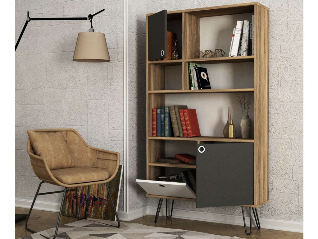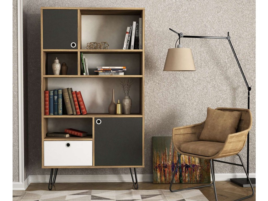 Regál SALTY sa pýši svojim moderným dizajnom a kombináciou antracitovej a orechovej farby, ktorá prináša do interiéru eleganciu a štýl. Štyri pevné police a tri skrinky poskytujú dostatok úložného priestoru pre vaše knihy, dekorácie či kancelárske potreby. Robustný LTD materiál s hrúbkou 18 mm zaisťuje dlhú životnosť a stabilitu tohto regálu.