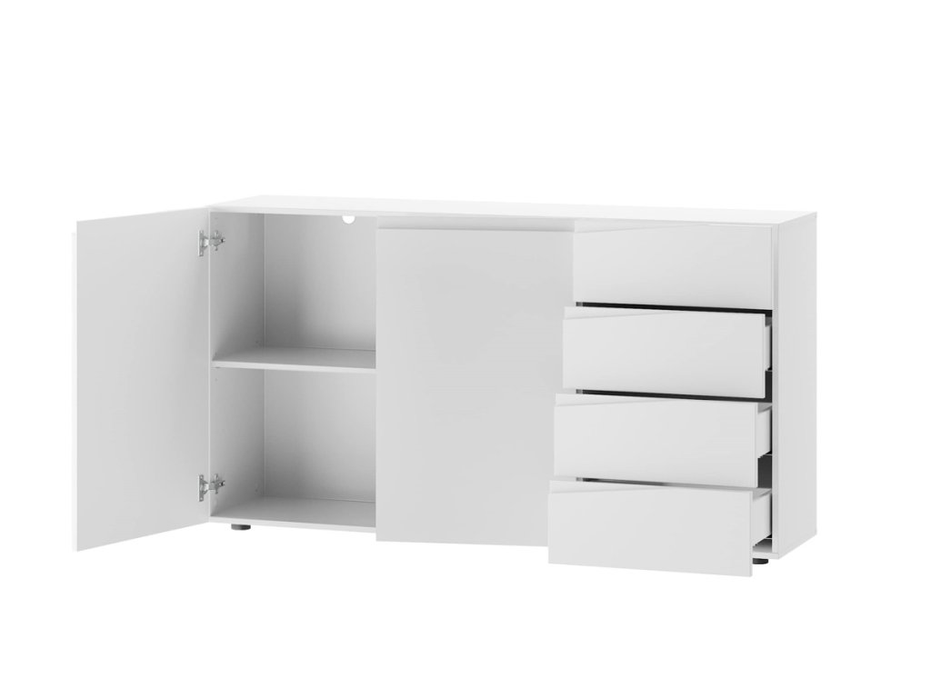 Komoda STAND je jedným z prvkov atraktívneho nábytku STAND. Zaujme vás svojim dizajnom a funčknosťou. Je vyrobená z MDF dosiek. Tie sú pokryté matnou fóliou v modernej bielej farbe. Komoda je dvojdverová. Vo vnútri nachádza polica. Disponuje tiež štyrmi praktickými zásuvkami. Komoda je bez úchytov. Rozmery (š,v,h): 150 x 83 x 38 cm. Nábytok STAND je v modernom a minimalistickom prevedení. Vďaka svojej univerzálnosti ho môžete použiť do rôznych miestností vášho domu. Výborne sa hodí do predsiene, obývačky alebo jedálne. Záleží len na vás a vašej fantázii, kde tento nábytok použijete. Jasné farby nábytku STAND rozsvietia a zútulnia interiér. Vďaka nemu sa budete cítiť u vás doma výborne. Dodávame v demontovanom stave. Záruka 24 mesiacov.Dodatočné parametre