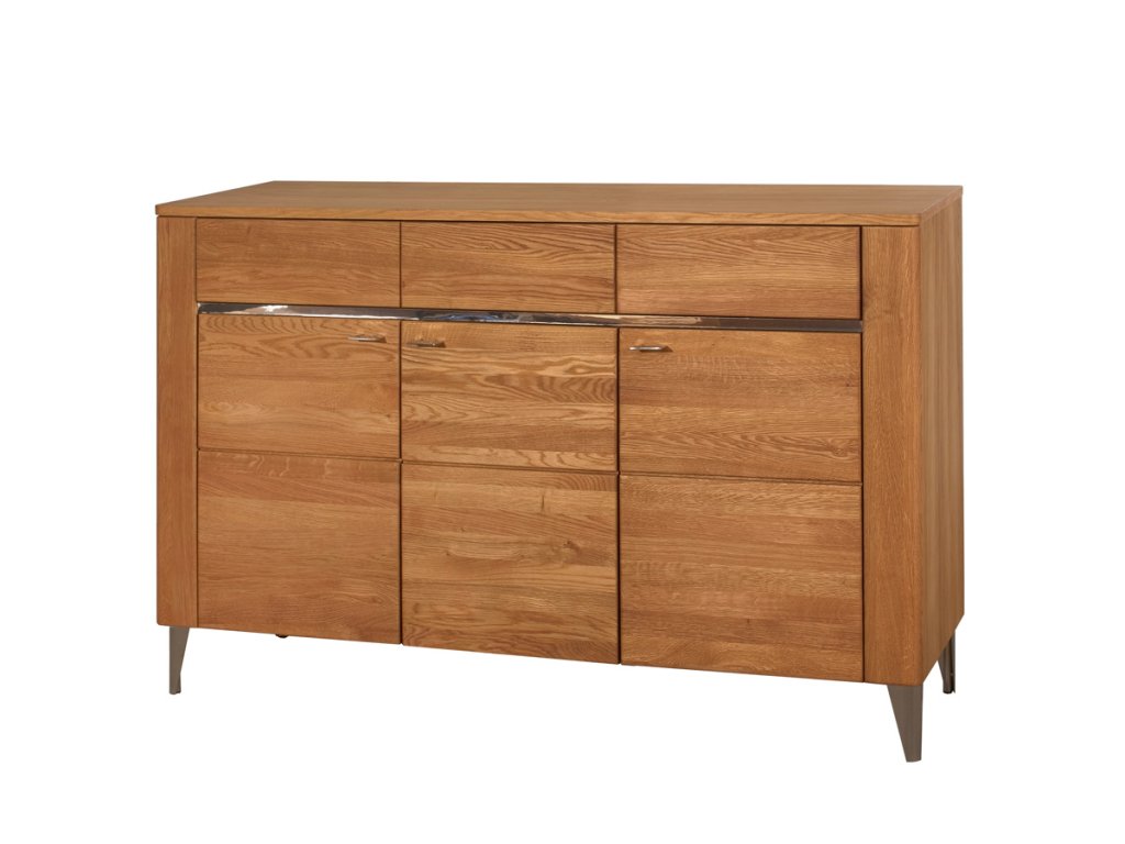 Korpus komody je vyrobený z prírodnej dyhy. Predná časť je vyrobená z masívu dubového dreva. Úchyty sú pochrómované, v striebornej farbe. Farebné prevedenie: dub medový. Disponuje vysokými elegantnými nožičkami.