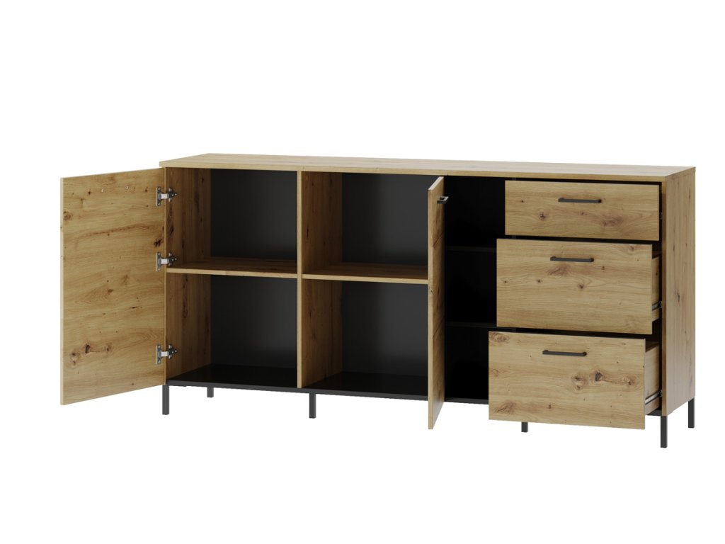 Komoda LOVENA je v atraktívnom a štýlovom prevedení. Zaujme aj náročnejších zákazníkov. Je vyrobená z kvalitných LTD dosiek, ktoré sú nenáročné na údržbu. Štýlové úchyty sú v tmavom prevedení. Vyrobené sú z plastu. Moderné nožičky komody sú vyrobené z kovu. Jej farebné prevedenie je v spojení farieb dub artisan, čierna matná. Komoda je dvojdverová. Vo vnútri sa nachádzajú dve police. Disponuje tromi praktickými zásuvkami. Má tiež dva otvorené úložné priestory vhodné na rôzne dekorácie. Rozmery (š,v,h): 180 x 88 x 42 cm. Môžete si ju dokúpiť k aktraktívnej obývacej stene LOVENA, ktorú máme tiež v ponuke. Dodávame v demontovanom stave.Dodatočné parametre