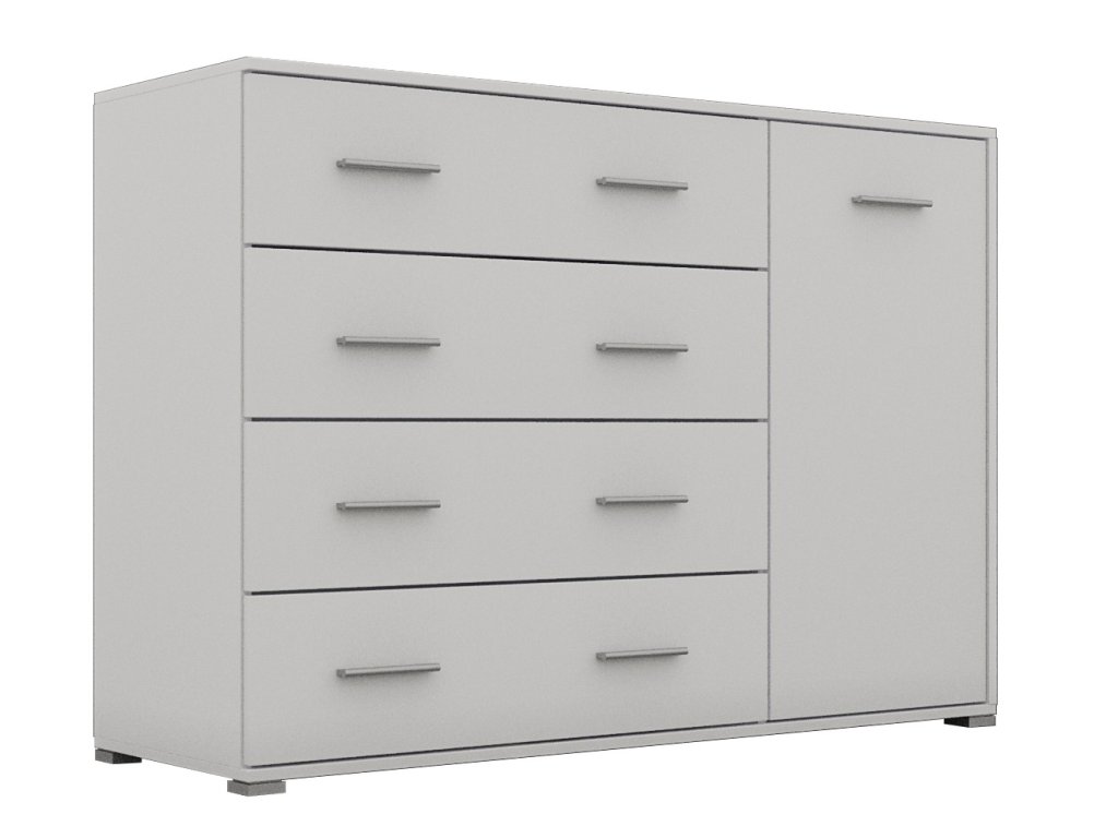 Kombinovaná komoda KAMONE 1D4S je funkčný a moderný nábytok vhodný do každého interiéru. Je vyrobená z LTD laminovaného materiálu. Farba biela mat (Nimfea albumu) dodáva komode príjemný a elegantný vzhľad. Komoda disponuje dvierkami, za ktorými sa nachádzajú dve police, a štyrmi zásuvkami.