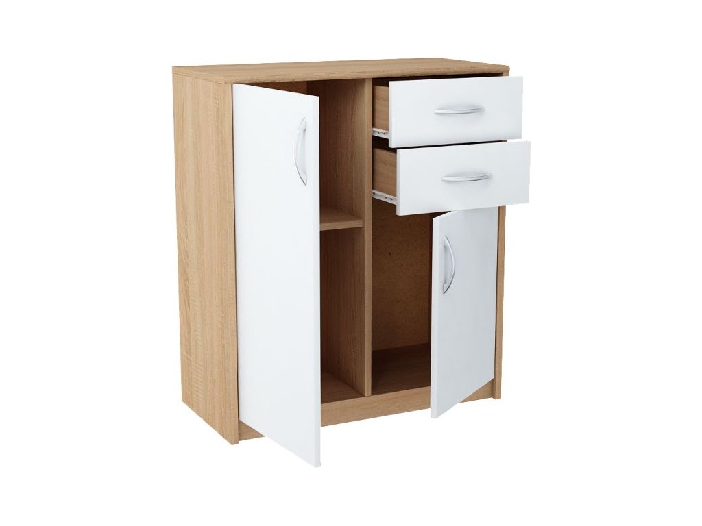 Dvojdverová komoda ANES s vnútornou policou a dvomi zásuvkami, je vyrobená z kvalitnej LTD dosky. Korpus skrinky je v modernom farebnom prevedení dub sonoma, dvierka komody sú v bielej farbe. K dispozícií máte ďalších 5 farebných prevedení na výber. Pojazdy v zásuvkách sú kovové s plastovými koliečkami. Úchytky sú z plastu vo farbe alumínium oblého tvaru. Dodávame v demontovanom stave.Dodatočné parametre