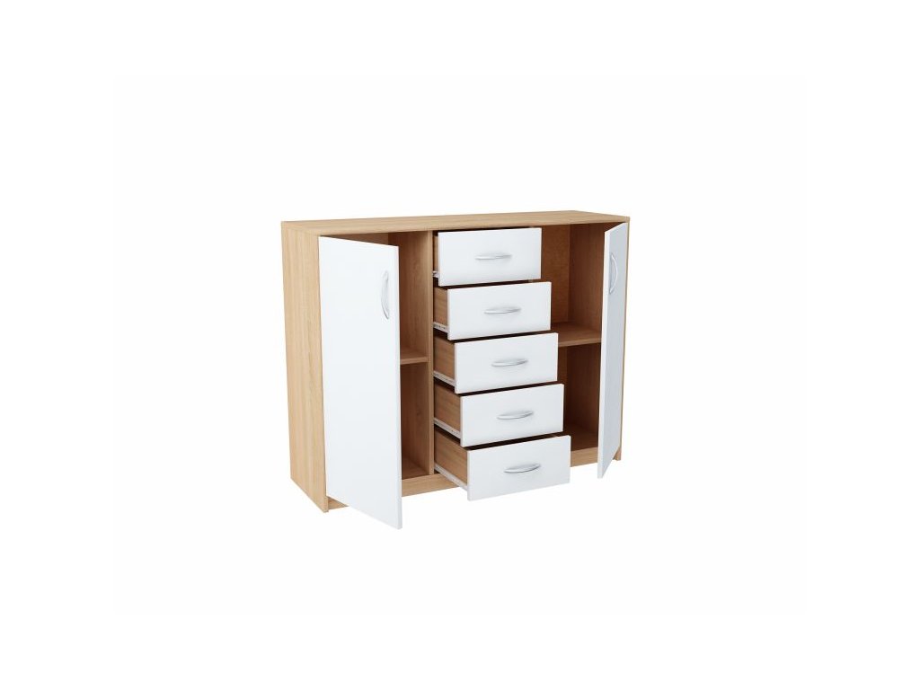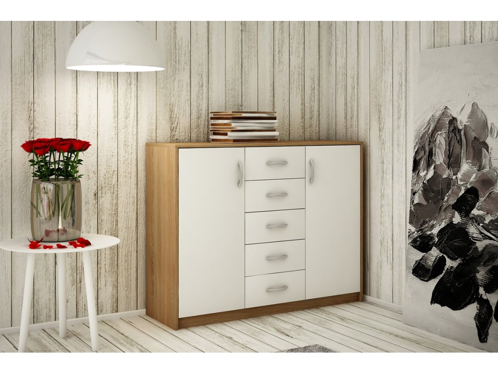 Dvojdverová komoda ANES s piatimi zásuvkami, je vyrobená z kvalitnej LTD dosky. Korpus komody je v obľúbenom farebnom prevedení dub sonoma, dvierka a zásuvky sú v bielej farbe. K dispozícií máte ďalších 5 farebných prevedení na výber. Pojazdy v zásuvkách sú kovové s plastovými koliečkami. Vnútro komody tvoria police. Úchytky sú z plastu vo farbe alumínium oblého tvaru. Dodávame v demontovanom stave.Dodatočné parametre