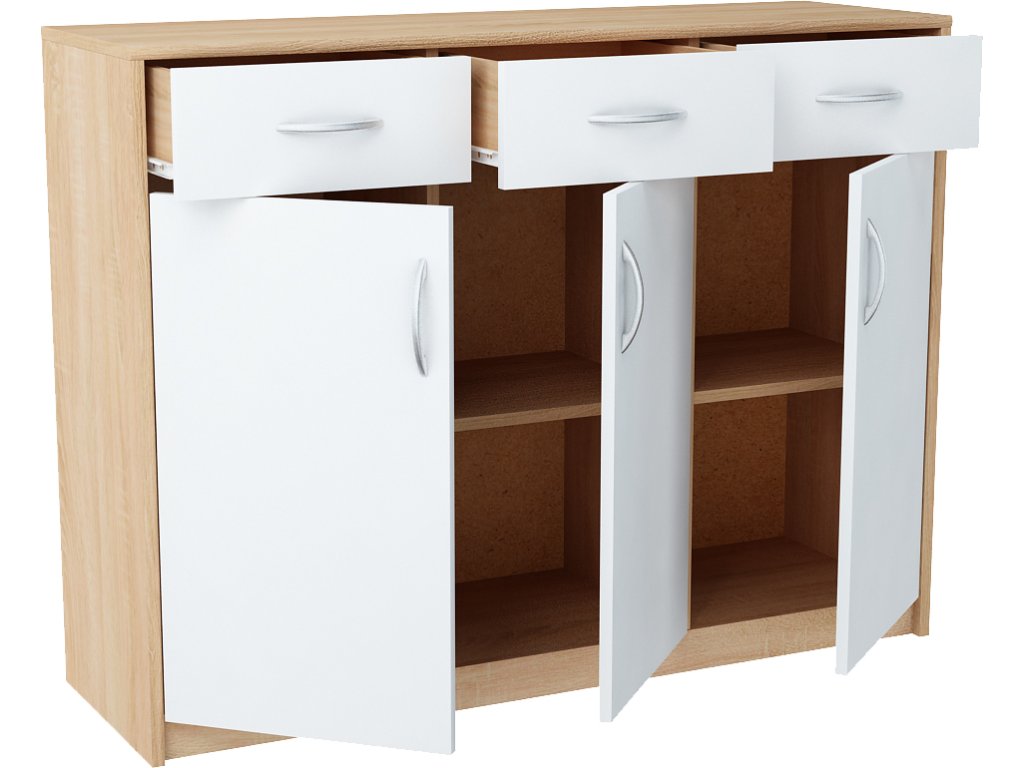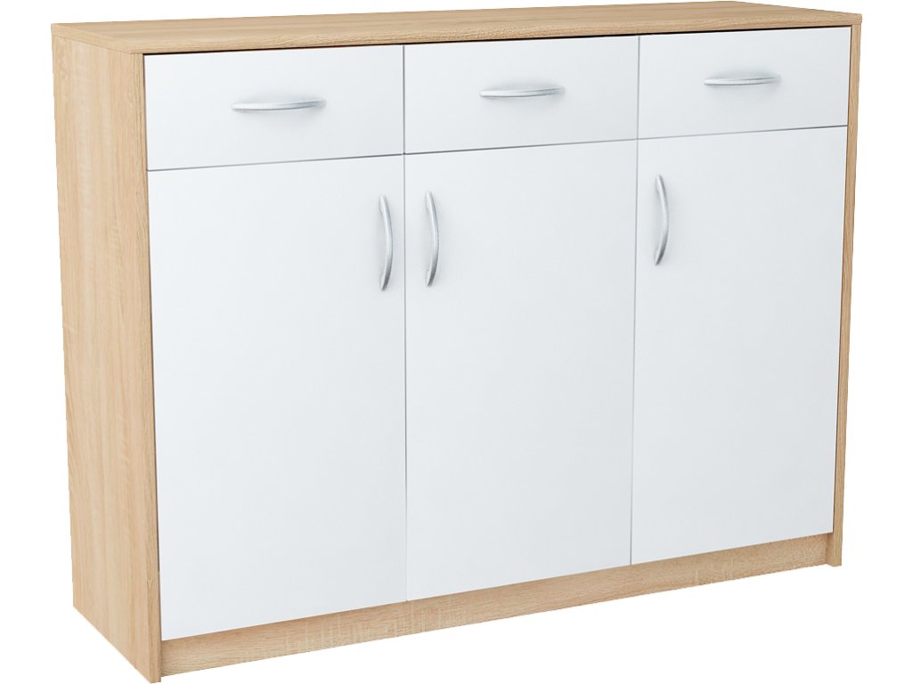 Trojdvierková komoda ANES s tromi zásuvkami, je vyrobená z kvalitnej LTD dosky. Korpus komody je v obľúbenom farebnom prevedení dub sonoma, dvierka a zásuvky sú v bielej farbe. K dispozícií máte ďalších 5 farebných prevedení na výber. Pojazdy v zásuvkách sú kovové s plastovými koliečkami. Vnútro komody tvoria police. Úchytky sú z plastu vo farbe alumínium oblého tvaru. Dodávame v demontovanom stave.Dodatočné parametre