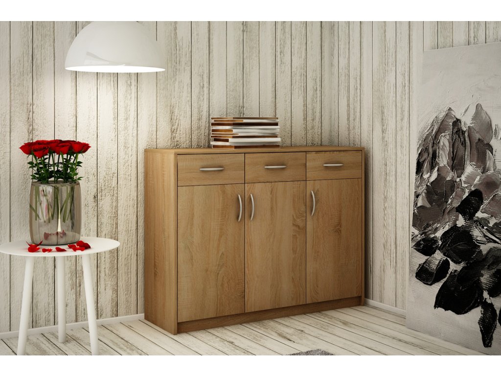 Trojdvierková komoda ANES s tromi zásuvkami, je vyrobená z kvalitnej LTD dosky. Korpus komody a takisto jej dvierka sú v obľúbenom farebnom prevedení dub sonoma. K dispozícií máte ďalších 5 farebných prevedení na výber. Pojazdy v zásuvkách sú kovové s plastovými koliečkami. Vnútro komody tvoria police. Úchytky sú z plastu vo farbe alumínium oblého tvaru. Dodávame v demontovanom stave.Dodatočné parametre