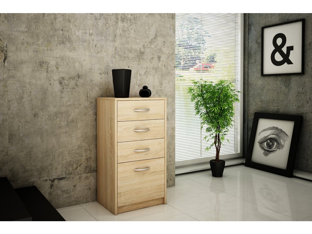 Štvor - zásuvková komoda ANES, je vyrobená z kvalitnej LTD dosky. Korpus komody a takisto zásuvky sú v obľúbenom farebnom prevedení dub sonoma. K dispozícií máte ďalších 5 farebných prevedení na výber. Pojazdy v zásuvkách sú kovové s plastovými koliečkami. Úchytky sú z plastu vo farbe alumínium oblého tvaru. Dodávame v demontovanom stave.Dodatočné parametre