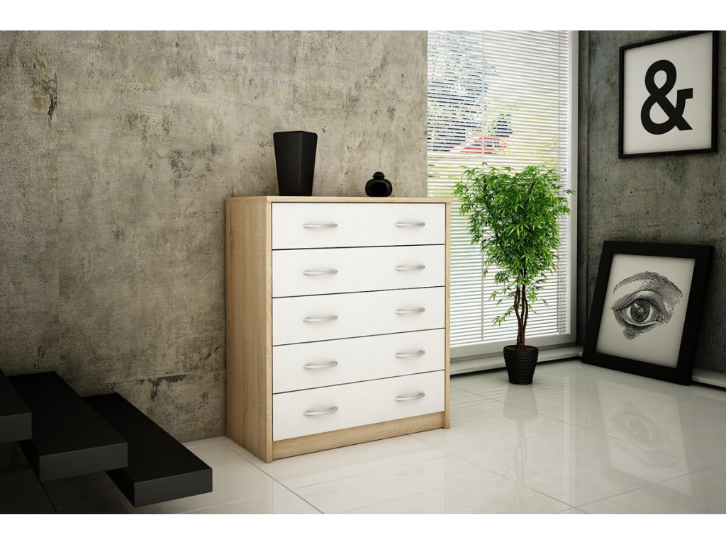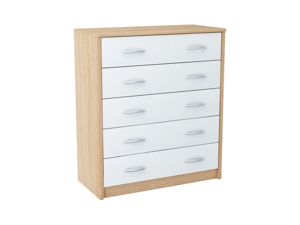Päť - zásuvková komoda ANES, je vyrobená z kvalitnej LTD dosky. Korpus komody je v obľúbenom farebnom prevedení dub sonoma, dvierka sú v bielej farbe. K dispozícií máte ďalších 5 farebných prevedení na výber. Pojazdy v zásuvkách sú kovové s plastovými koliečkami. Úchytky sú z plastu vo farbe alumínium oblého tvaru. Dodávame v demontovanom stave.Dodatočné parametre