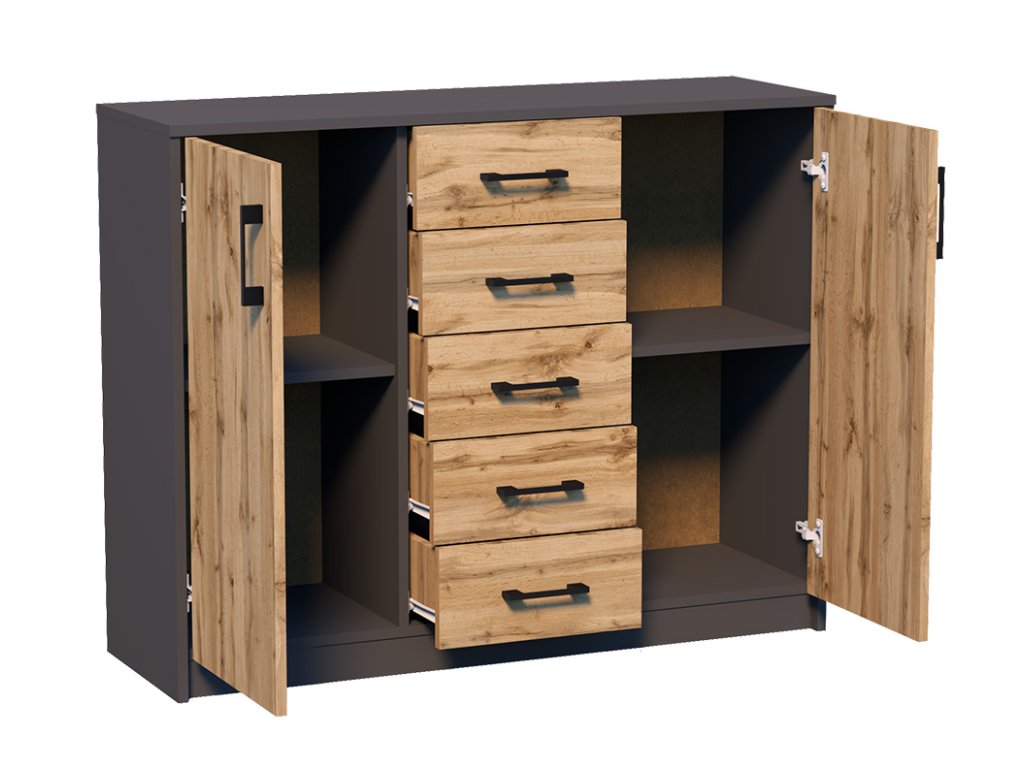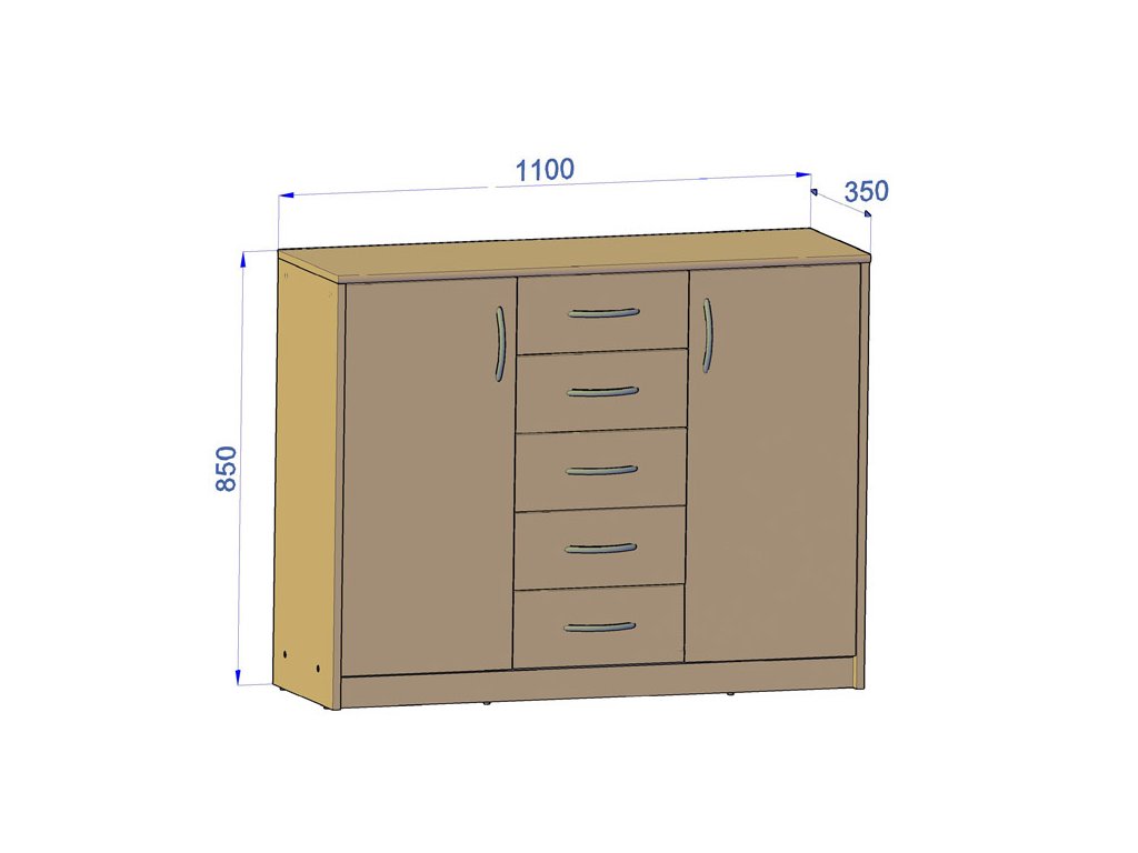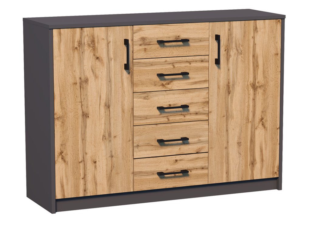 Dvojdverová komoda s piatimi zásuvkami, je vyrobená z kvalitnej LTD dosky. Hrúbka materiálu 16 mm.