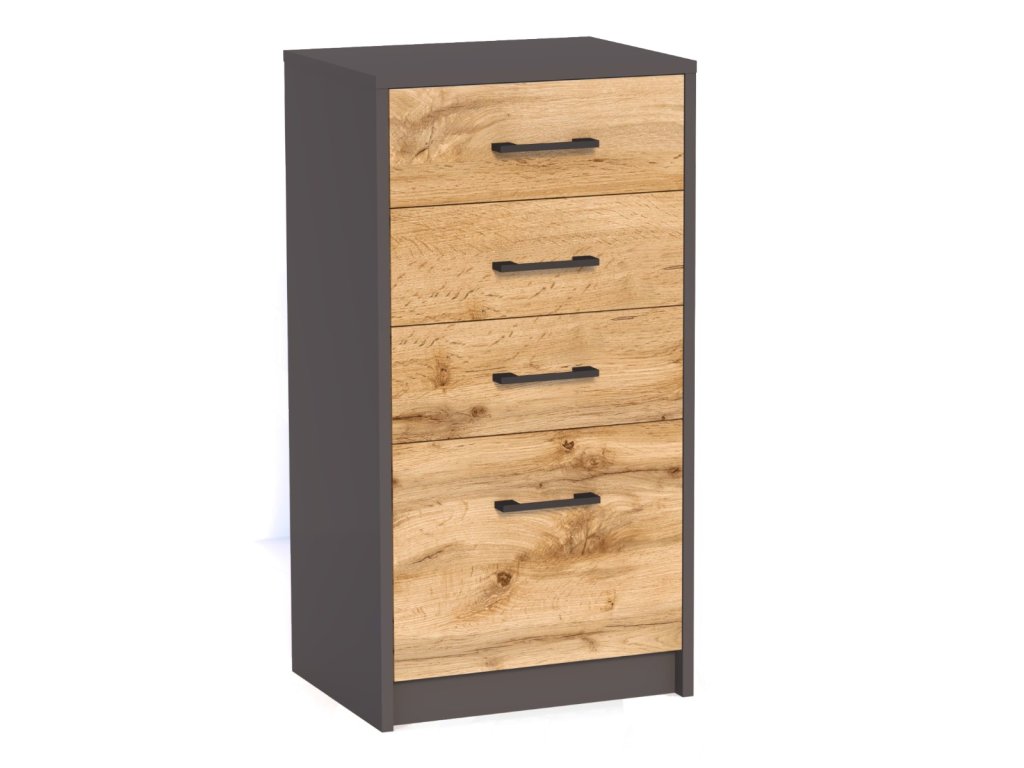 Korpus komody je vyrobený vo farbe grafit, zásuvky sú v obľúbenom farebnom prevedení dub Wotan.