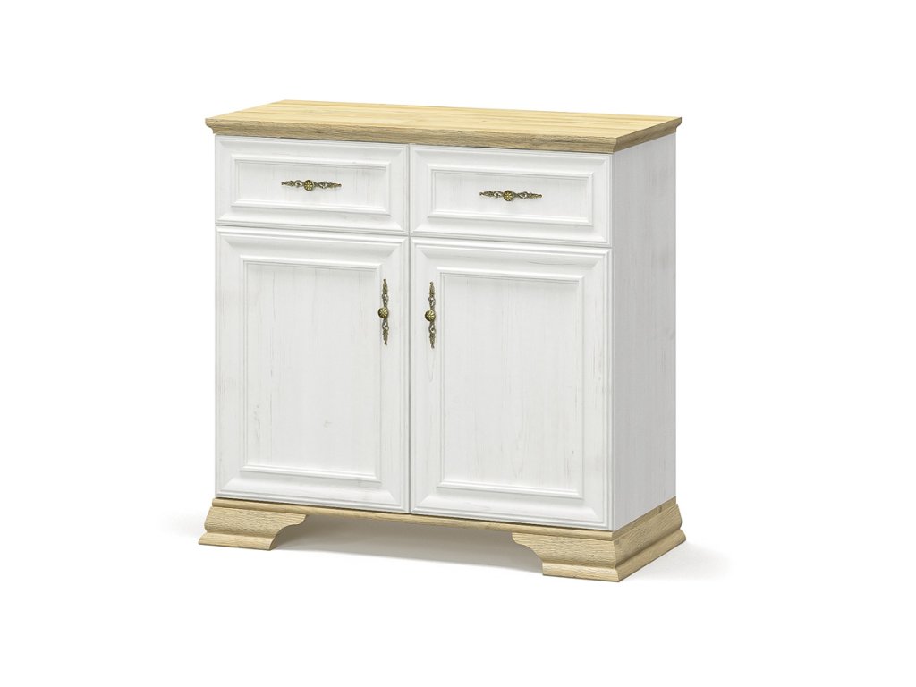 JARMANKA je sektorový prvok s rustikálnym nádychom. Jeho štýlové prevedenie je podfarbené kombináciou kontrastných farieb borovice anderson a dub zlatý. Svetlé farby rozjasnia priestor a opticky ho zväčšia. Efektné úchyty s ornamentom v zlatom farebnom prevedení, dodávajú nábytku šmrnc a eleganciu. Elegantné oblé hrany nájdete ako na štýlovom prevedení nožičiek tak aj na dvierkach a hornej zakončovacej lište. Komoda ponúka úložný priestor rozdelený na viacero častí. V spodnej časti za 2 dvierkami nájdete 1 poličku, horná časť disponuje 2 šuplíky. Nábytok je vyrobený z kvalitnej LTD dosky, ktorej nenáročnosť na údržbu ocení každý majiteľ. Rozmery (š/v/h): 93,4 x 88,7 x 39 cm. V našej ponuke nájdete aj ďalšie prvky sektora JARMANKA, z ktorých si viete poskladať štýlovú obývaciu izbu či efektnú spálňu. Dodávame v demonte.Dodatočné parametre