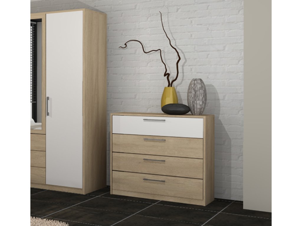 Malá komoda 4S zo spálňového sektoru EMILY. Komoda má 4 zásuvky. Je vyrobená z LTD materiálu, ktoré sa ľahko udržiava. Rozmer komody (v/š/h) 90 x 98 x 38 cm. Zaujímavé farebné prevedenie dub sonoma v kombinácii s bielou farbou. Spálňovom sektore EMILY si môžete vybrať manželskú posteľ s nočnými stolíkmi, komody či šatníkovú skriňu.
