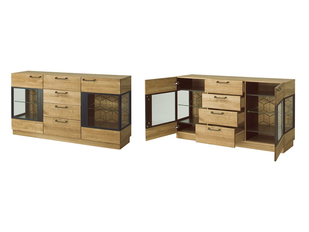 Komoda MOZAIK vás zaujme svojim elegantným a zároveň luxusným prevedením. Je zo sektoru MOZAIK, vďaka ktorému si poskladáte vašu obývačku podľa predstáv. Je vyrobená z lešteného a olejovaného masívneho dreva. Farebné prevedenie: dub/čierna matná. Úchyty sú v čiernej matnej farbe, vyrobené z kovu. Komoda je dvojdverová. Vo vnútri sa nachádzajú praktické police. Disponuje tiež štyrmi zásuvkami v strednej časti komody. LED osvetlenie nie je súčasťou. Je možné si ho dokúpiť (viď. doporučené produkty). Sektorový nábytok MOZAIK vám ponúka moderný dizajn a kvalitné prevedenie. Prírodná vôňa masívneho dreva a dlhá životnosť nábytku vás presvedčia, že nábytok MOZAIK je to najlepšie riešenie. Nábytok sa ľahko kombinuje s akýmkoľvek interiérom. Vďaka svojmu prevedeniu zútulní vašu obývaciu miestnosť. Výhodou nábytku MOZAIK je, že sa dodáva už zmontovaný. Záruka 24 mesiacov.Dodatočné parametre