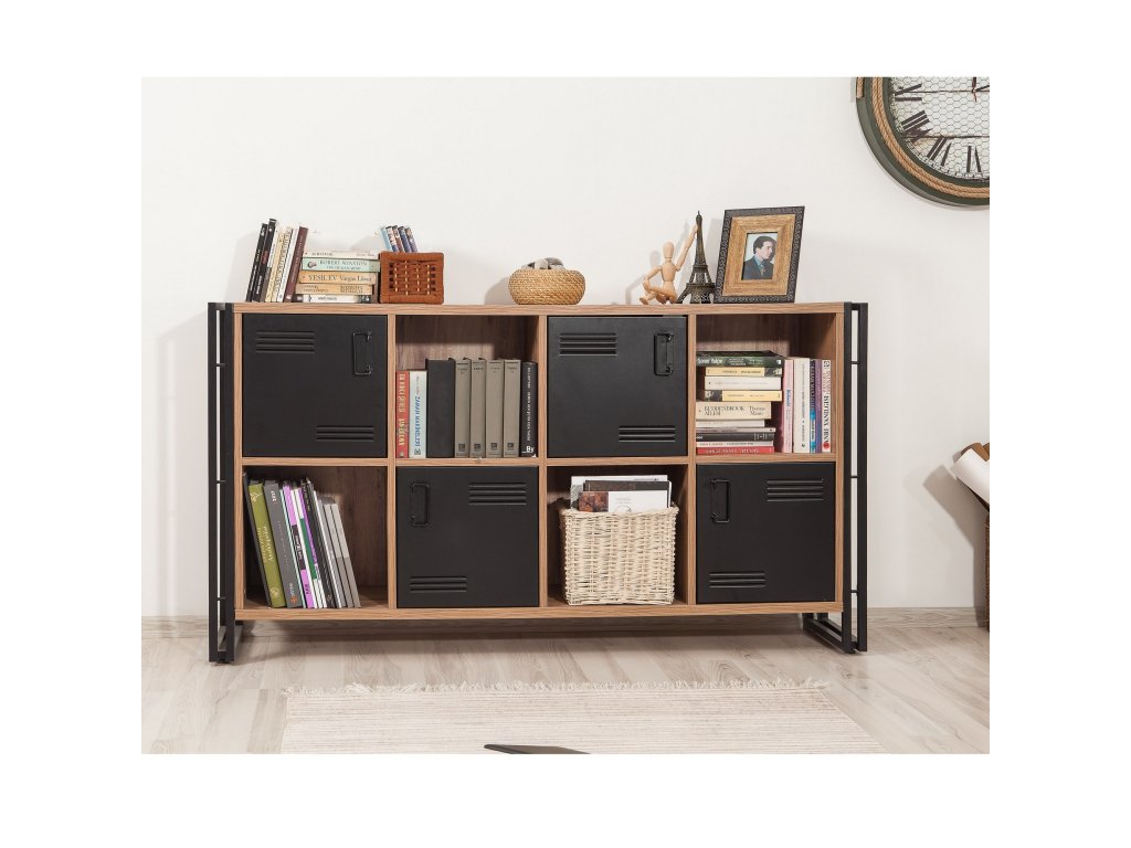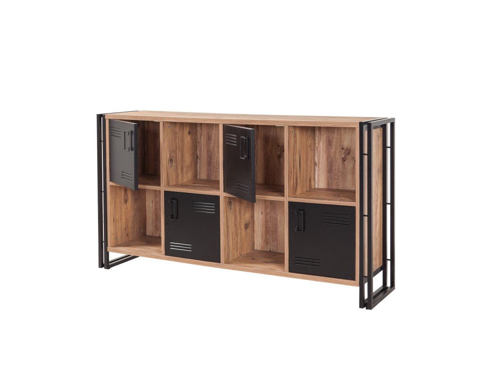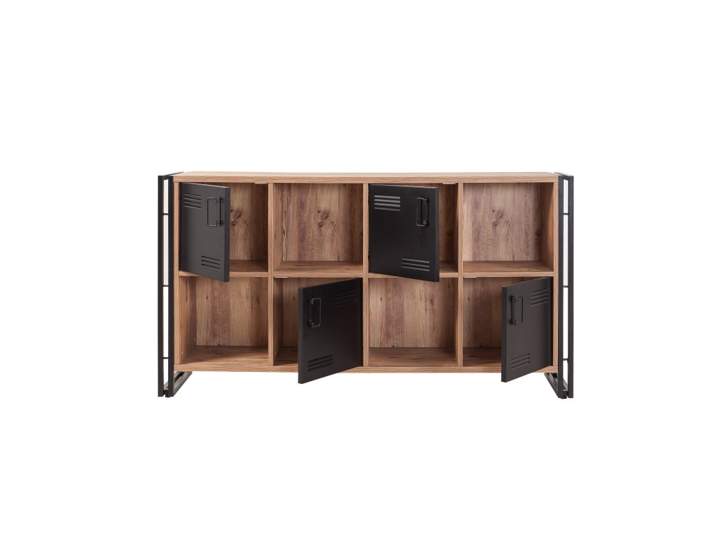 Robustná konštrukcia a kvalitné materiály zaisťujú dlhú životnosť a stabilitu. Kovové úchytky dodávajú komode elegantný industriálny vzhľad, ktorý dokonale ladí s prírodnými tónmi borovice a čiernymi prvkami.
