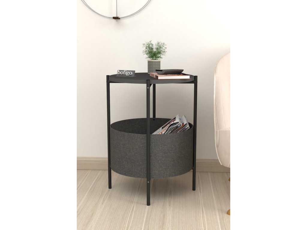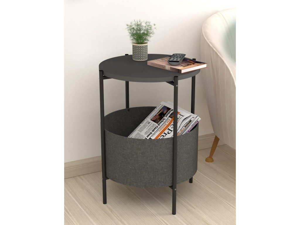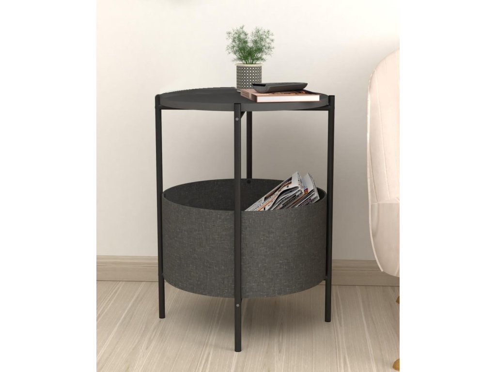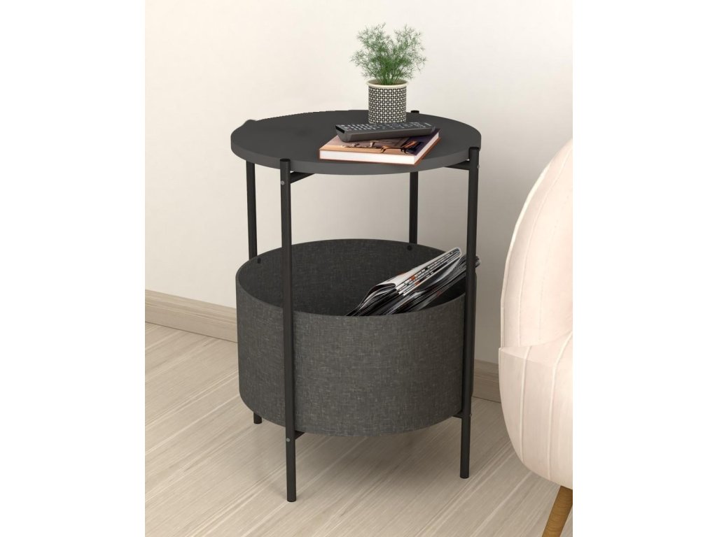 Vrchná doska stolíka je z LTD materiálu, ktorý je nenáročný na údržbu. Hrúbka 18 mm. Konštrukcia je z kovu v čiernom farebnom prevedení. Košík na uloženie vecí je vyrobený z kvalitnej látky. Možno ho vyprať.