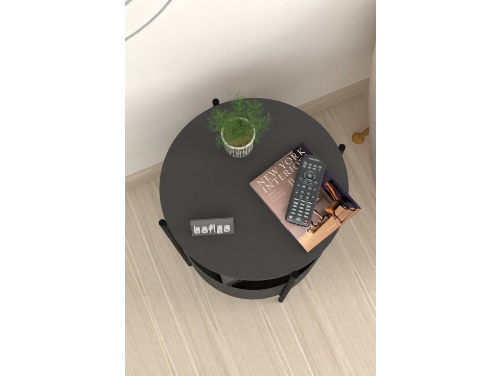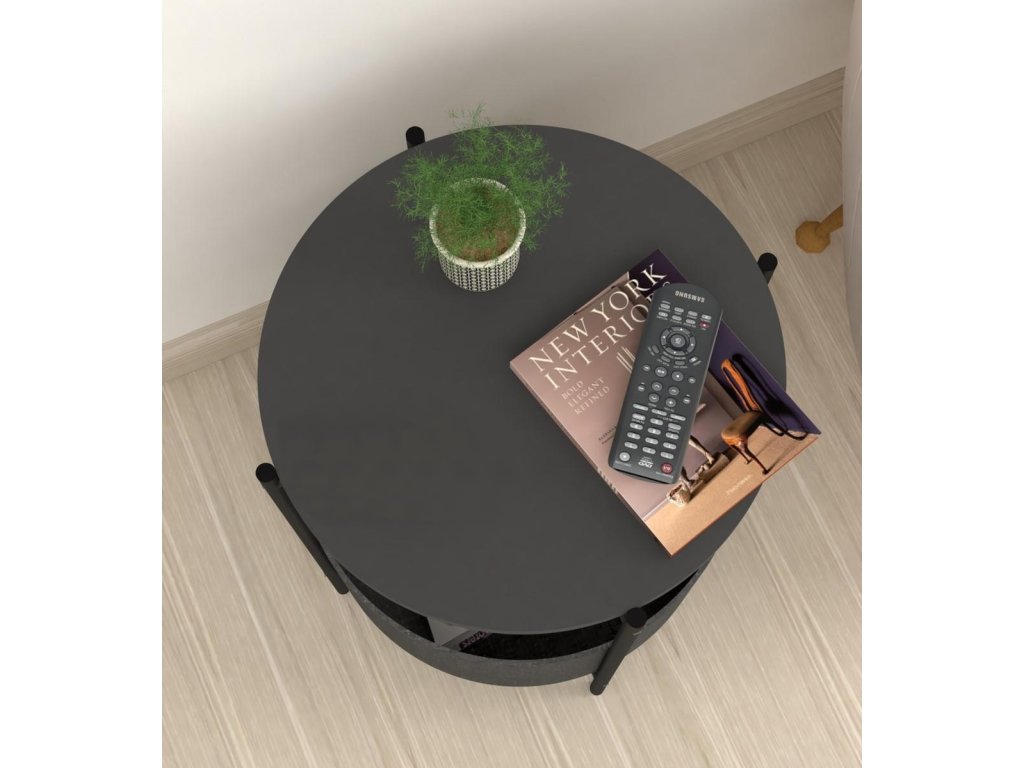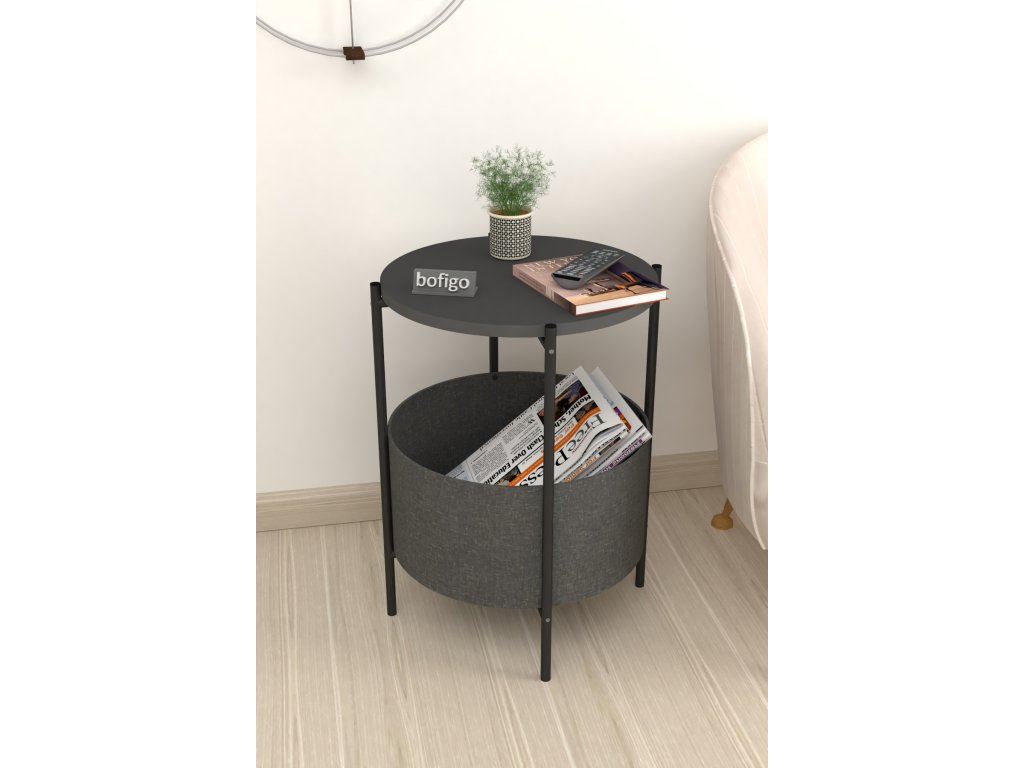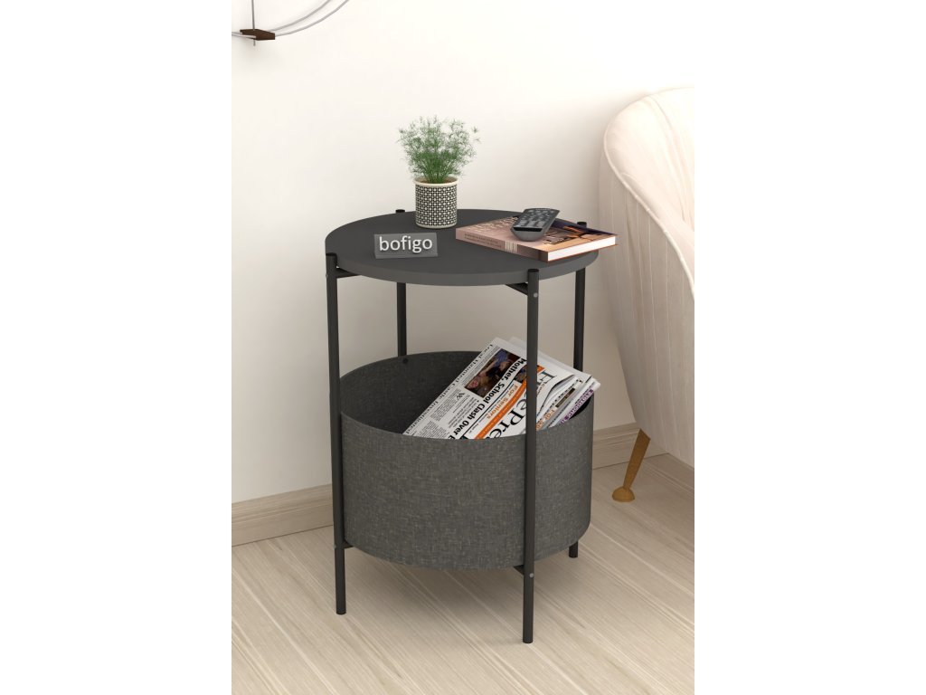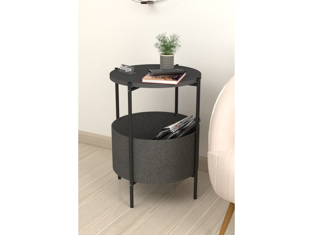 Vrchná doska stolíka je z LTD materiálu, ktorý je nenáročný na údržbu. Hrúbka 18 mm. Konštrukcia je z kovu v čiernom farebnom prevedení. Košík na uloženie vecí je vyrobený z kvalitnej látky. Možno ho vyprať.