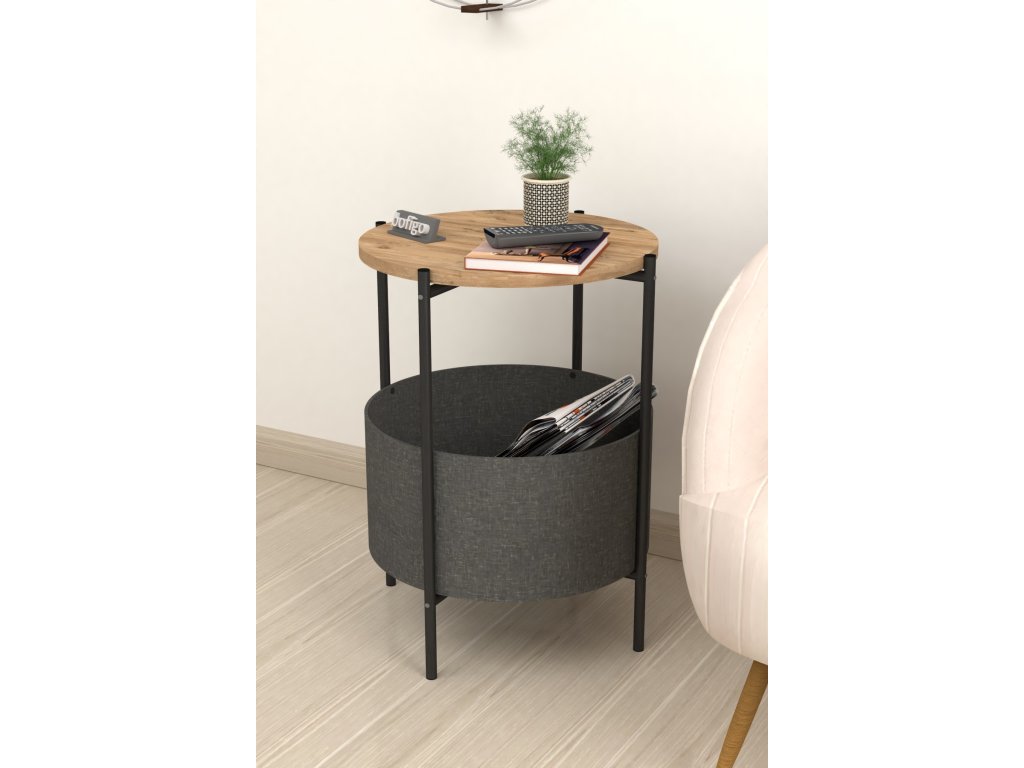 Vrchná doska stolíka je z LTD materiálu, ktorý je nenáročný na údržbu. Hrúbka 18 mm. Konštrukcia je z kovu v čiernom farebnom prevedení. Košík na uloženie vecí je vyrobený z kvalitnej látky. Možno ho vyprať.